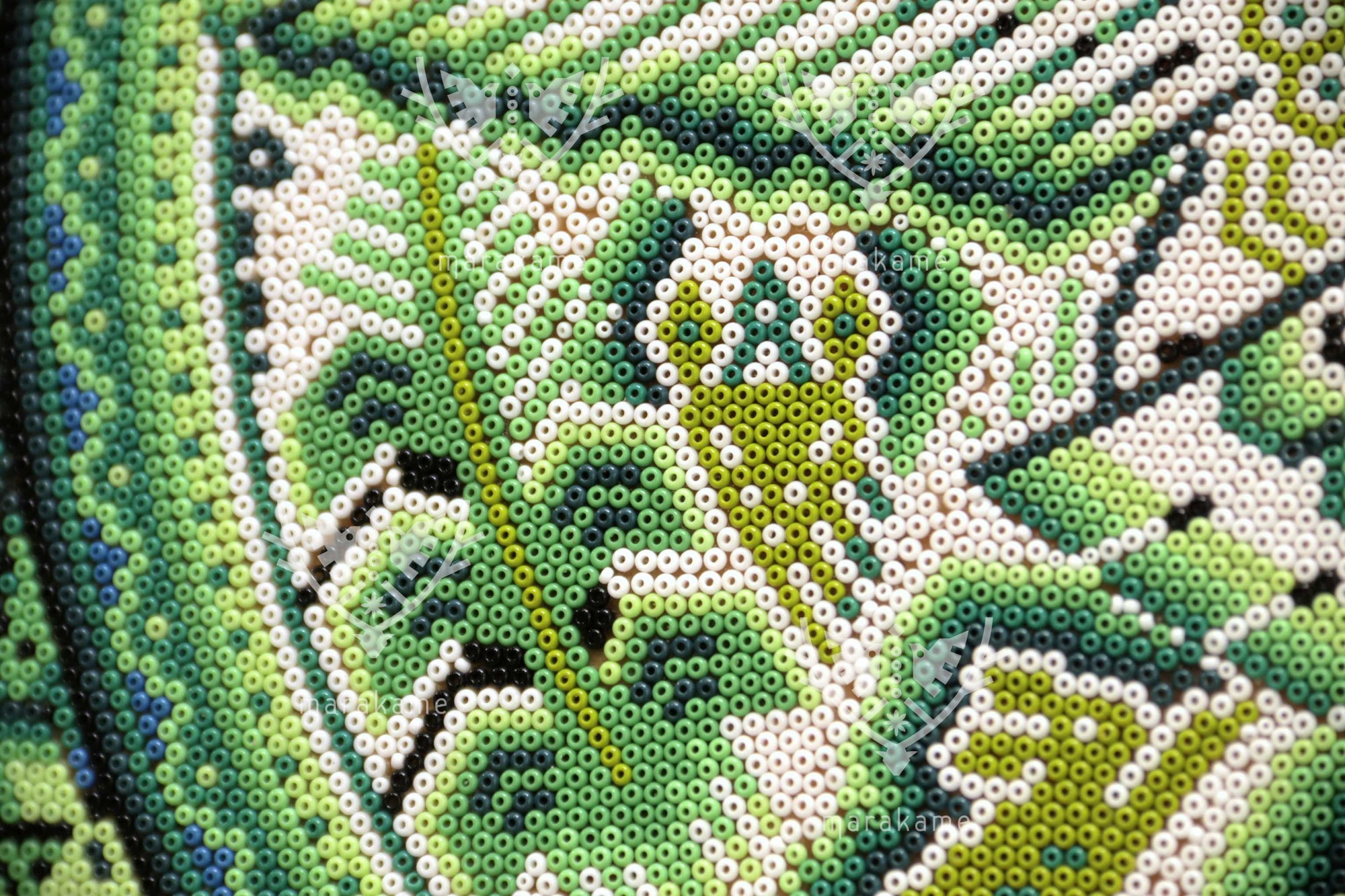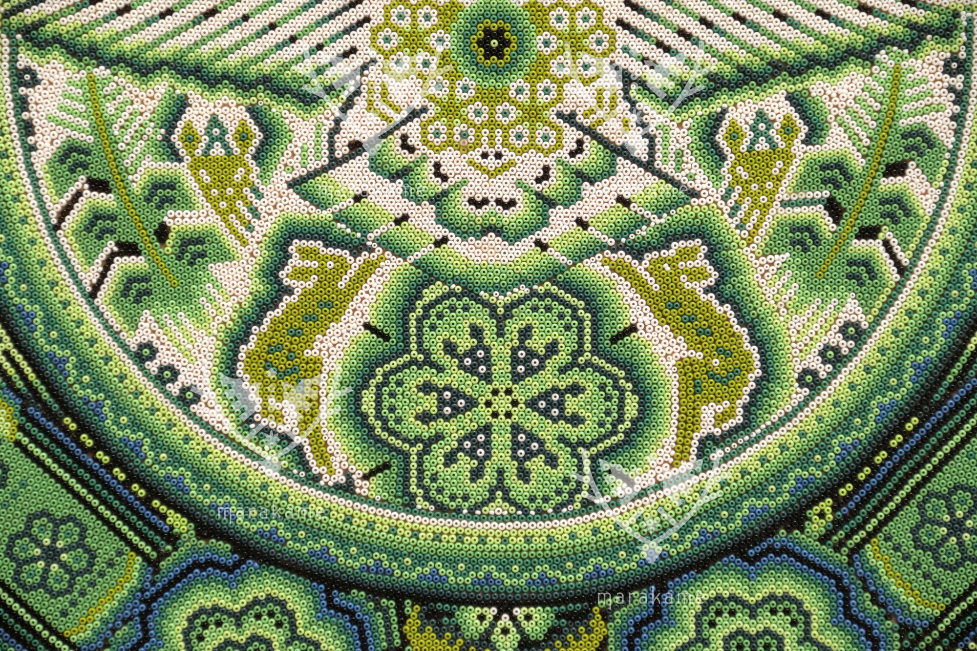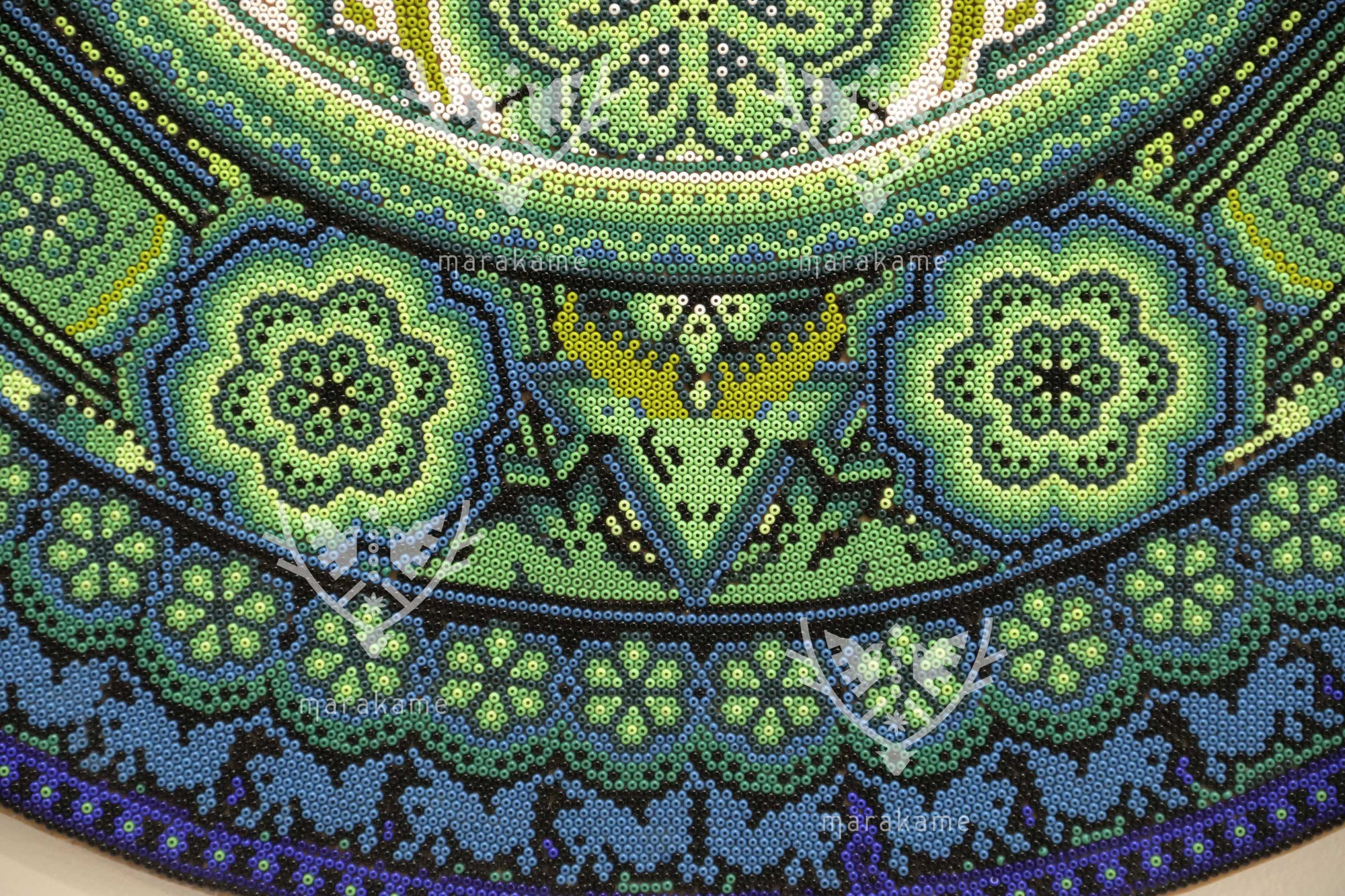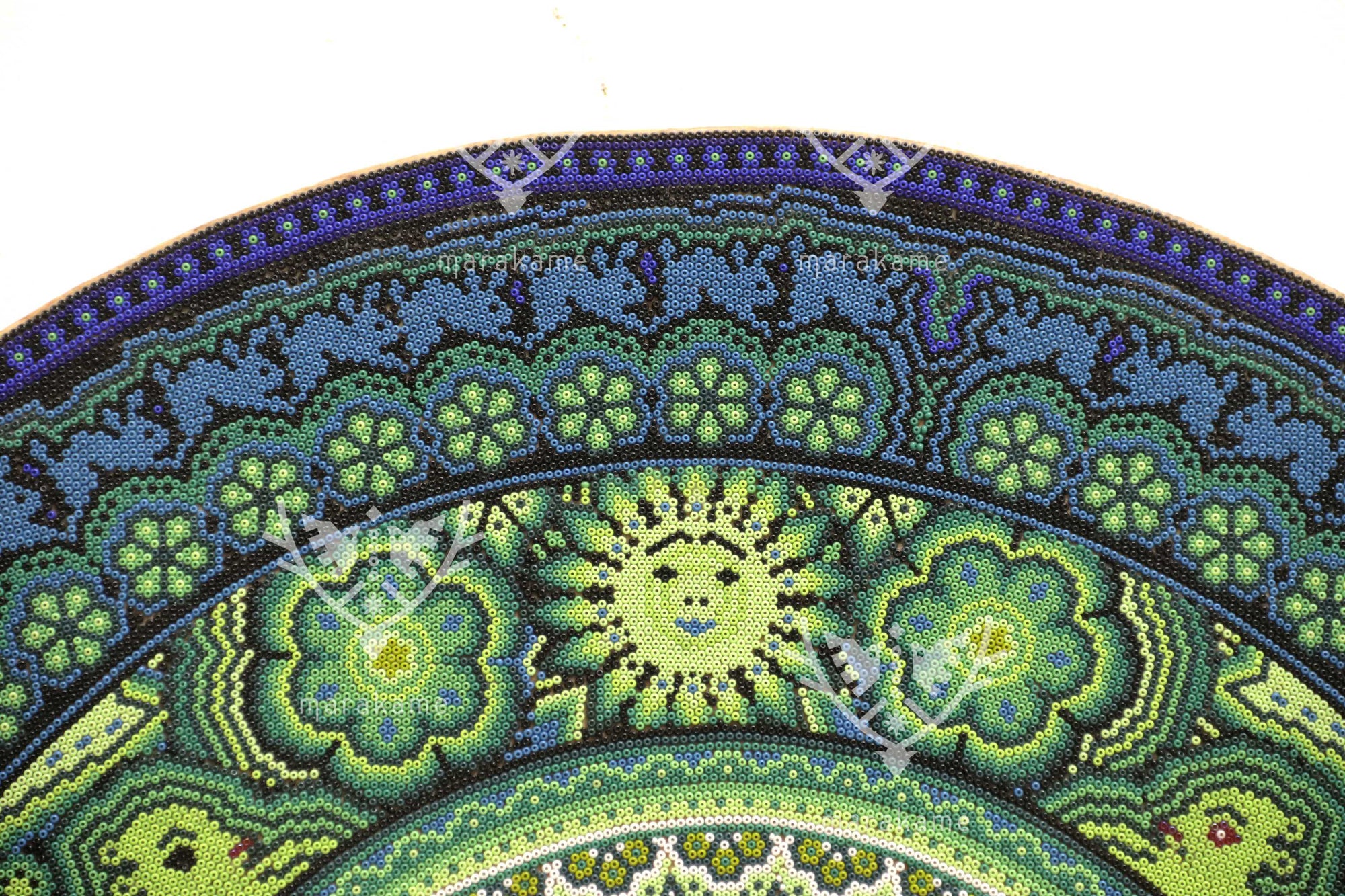 • ◇ Técnica: Chaquira de cristal calibrado 11/0 prensada con cera de campeche sobre círculo de madera.