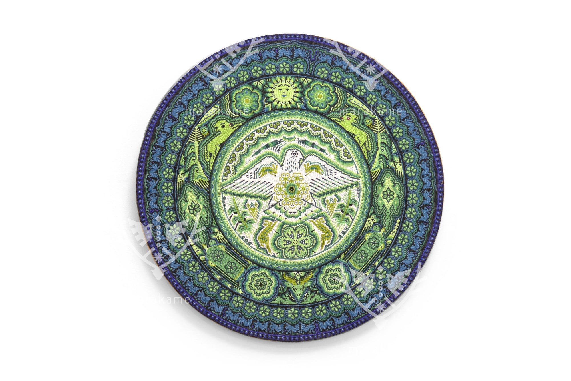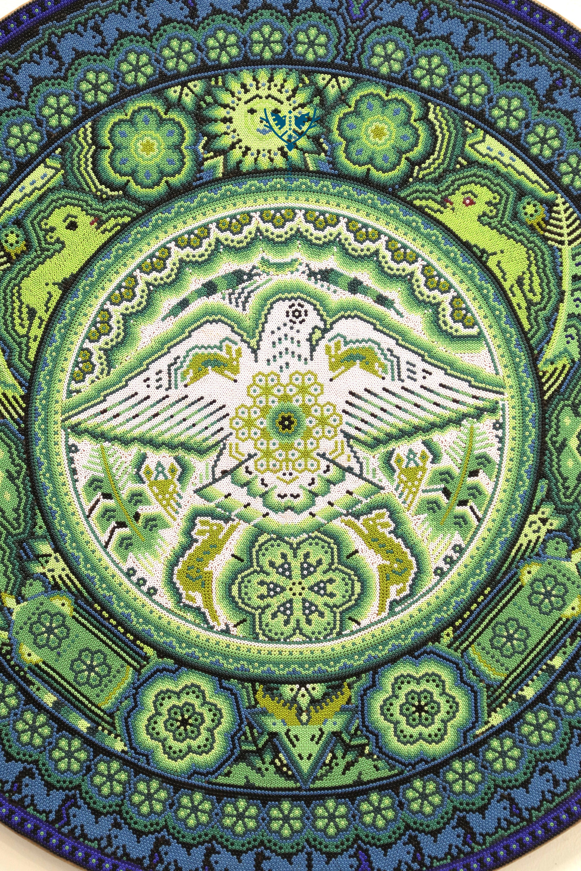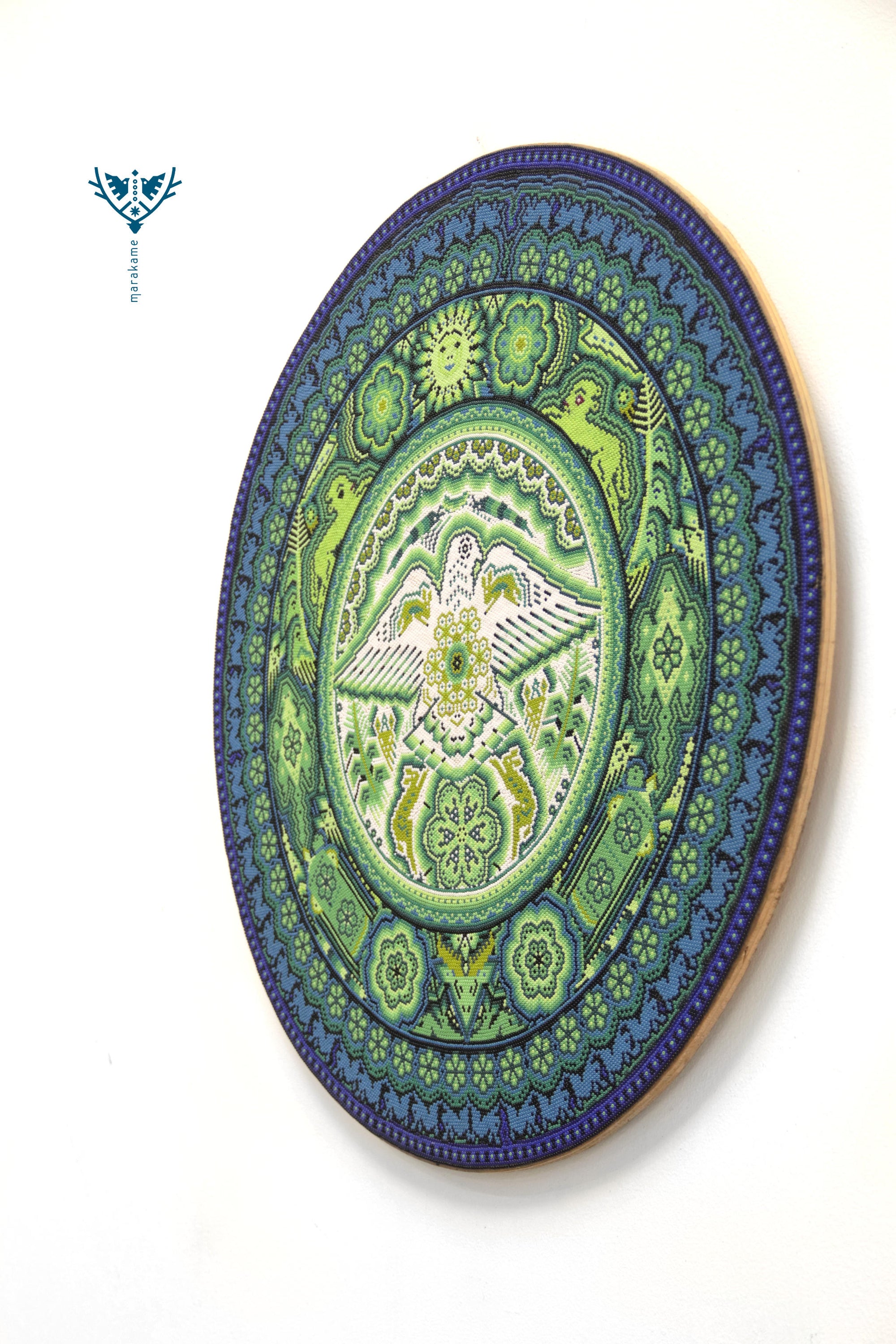 En un círculo de microchaquira brillante, el águila extiende su vuelo sagrado. En su vientre, el peyote resplandece, portador de visiones y mensajes ancestrales. Su plumaje, en tonos azules y verdes, vibra con la esencia del agua y la vida, mientras su espíritu conecta el cielo con la tierra.