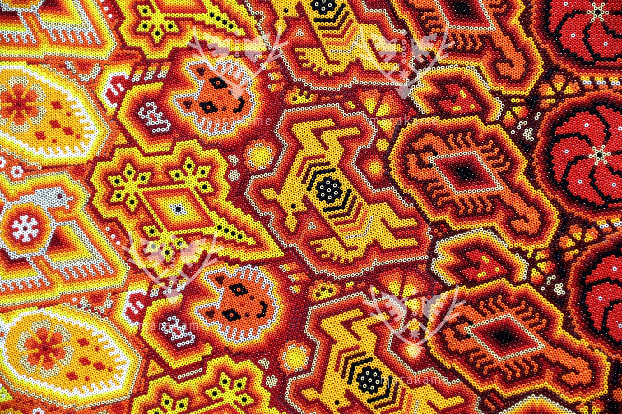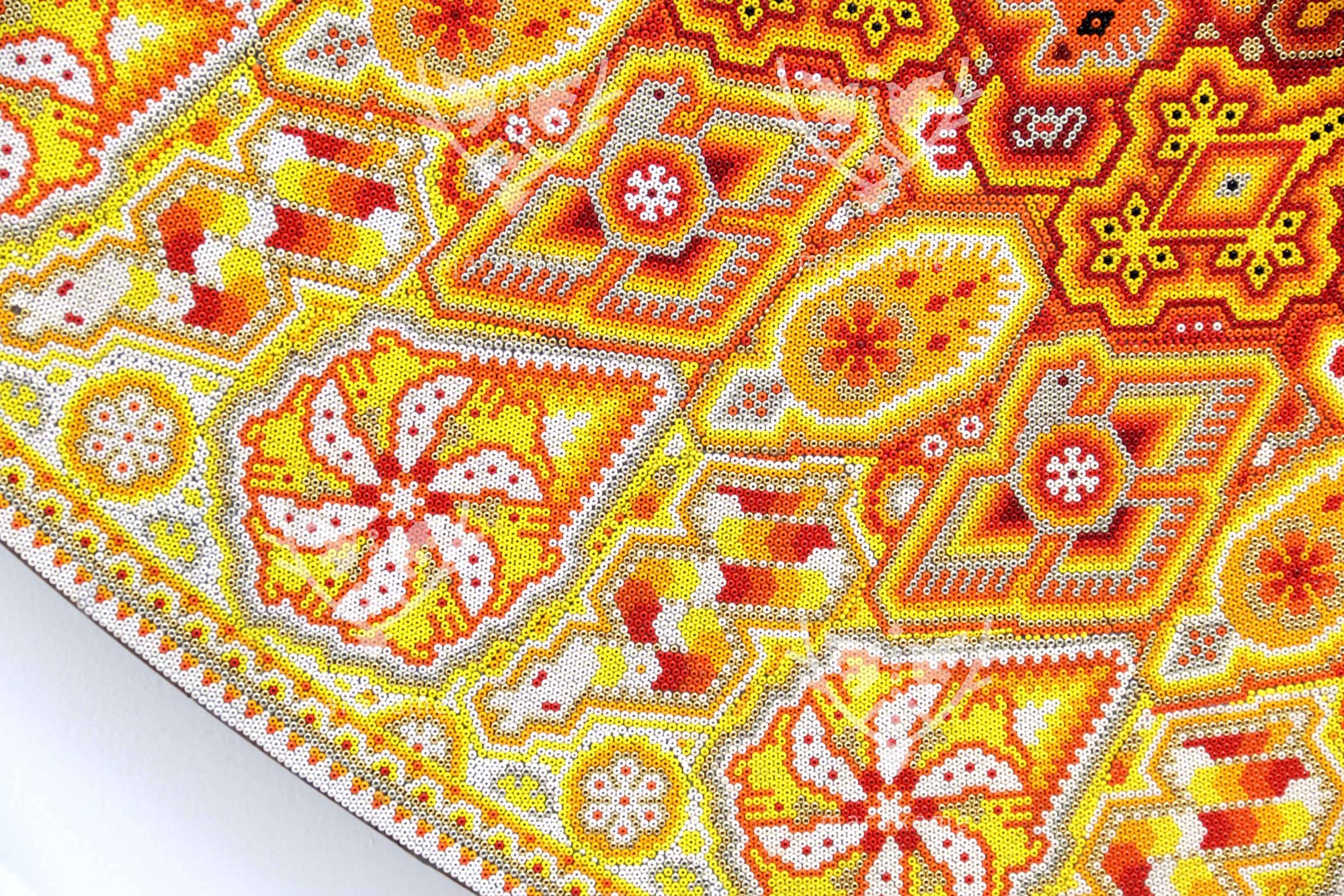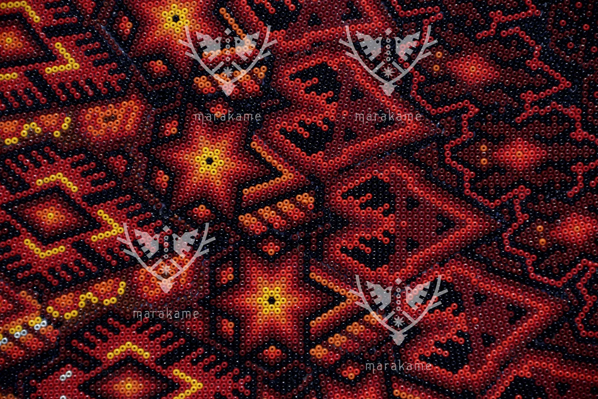 La estructura concéntrica de la pieza recuerda a un nierika (portal de visión): un mandala que no solo representa, sino que activa. La acumulación rítmica de figuras geométricas —estrellas, pétalos, espirales— forma una red que vibra con una precisión matemática cargada de energía ritual. El uso de chaquira de cristal checoslovaca aporta una cualidad luminosa que cambia con la luz, intensificando la sensación de fuego vivo.