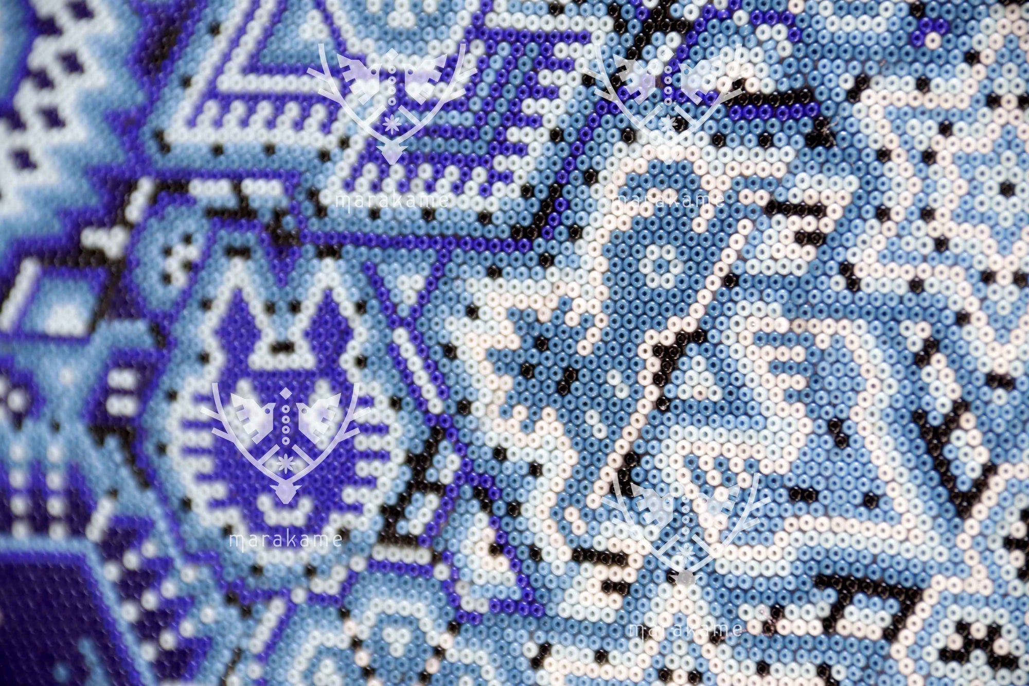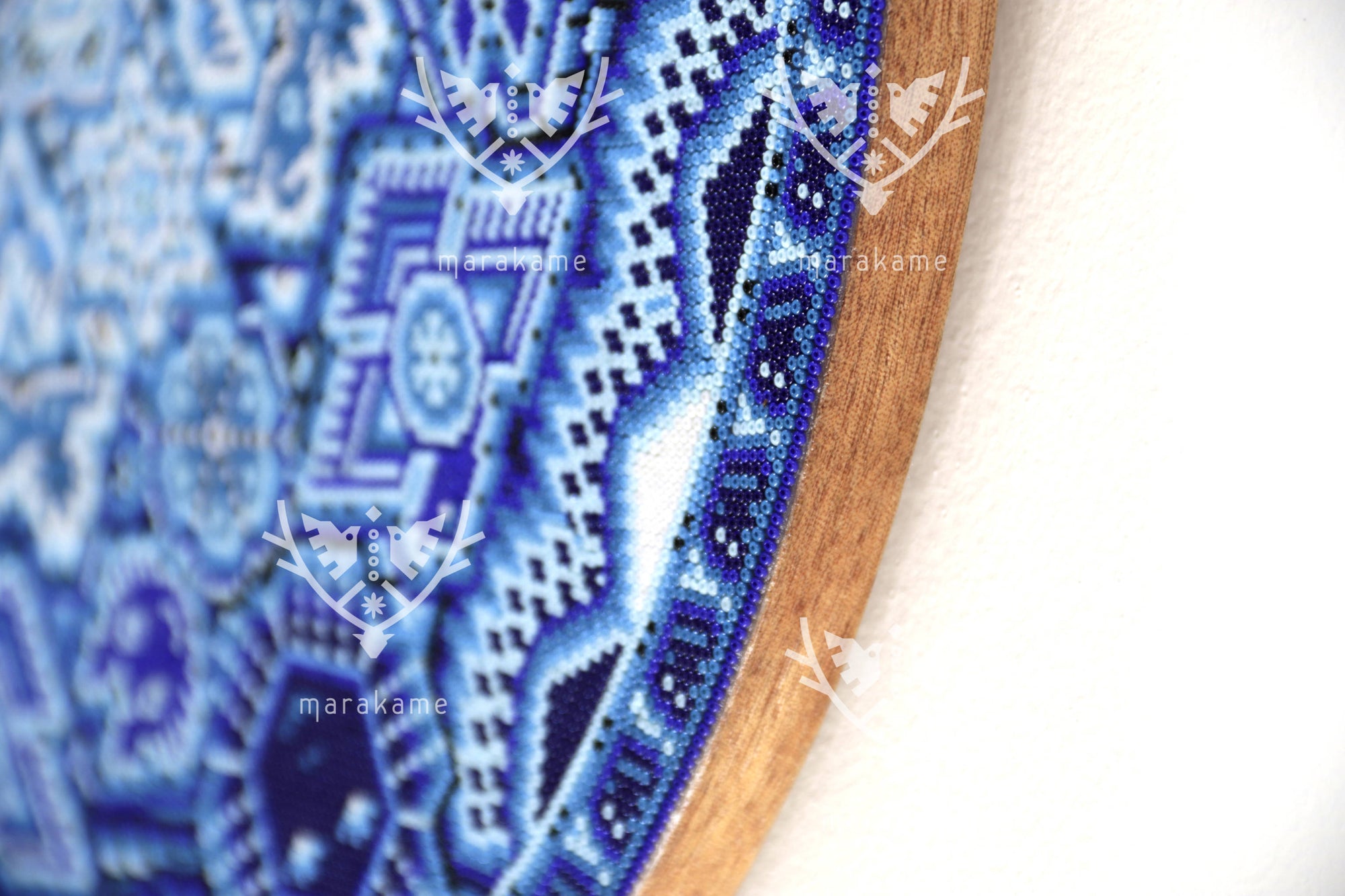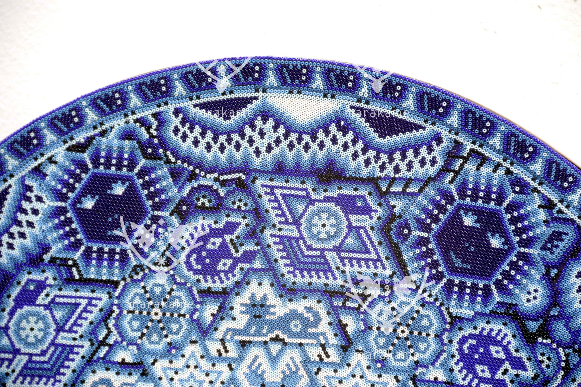 Esta obra excepcional, tejida con paciencia y devoción, es un Nierika huichol circular de 40.3 cm de diámetro, elaborado con micro chaquira de cristal en tonalidades azules. Su diseño minucioso evoca los cantos y plegarias dirigidos a Tatei Nariwame, la madre de la lluvia, deidad sagrada que nutre la tierra y bendice los cultivos.