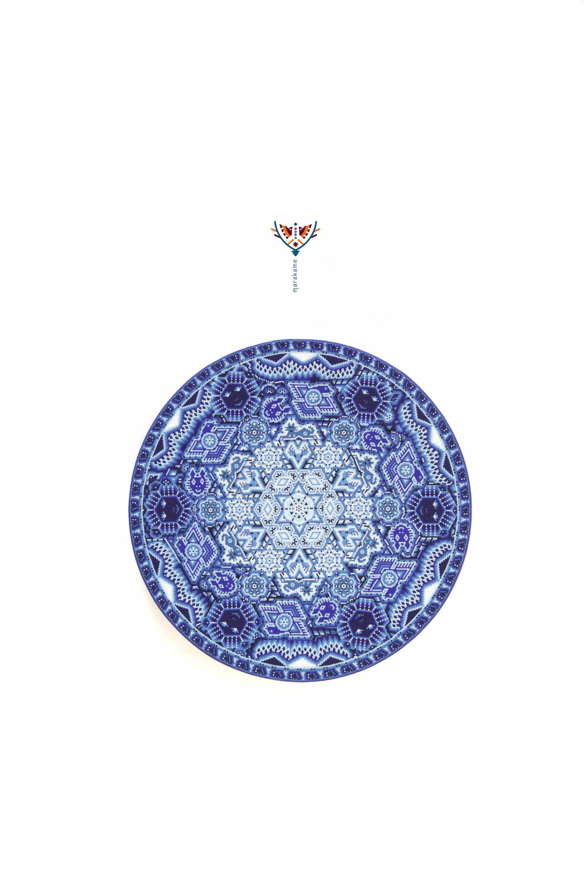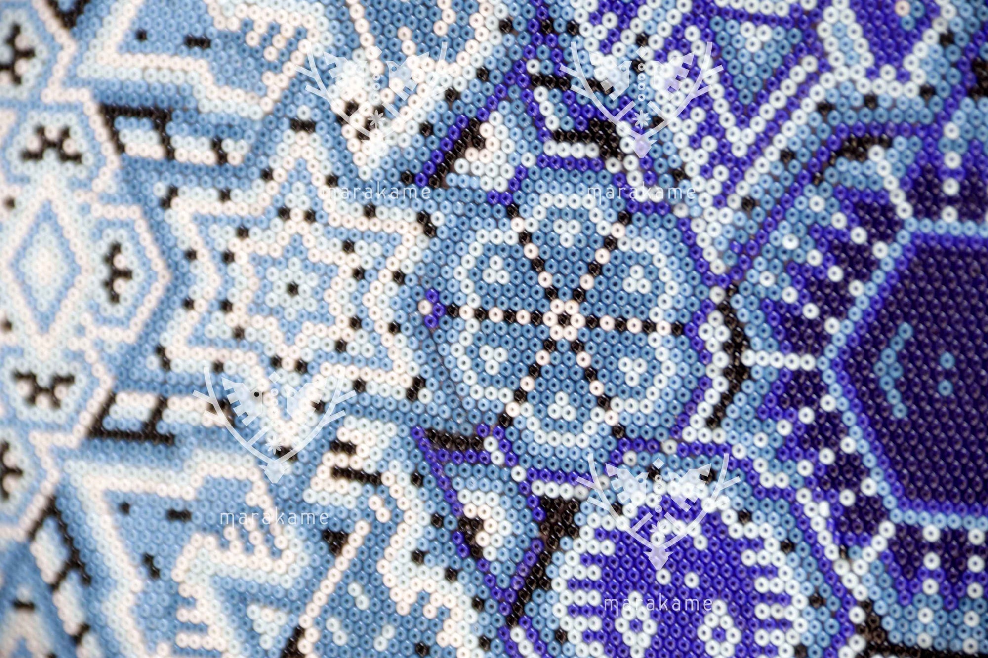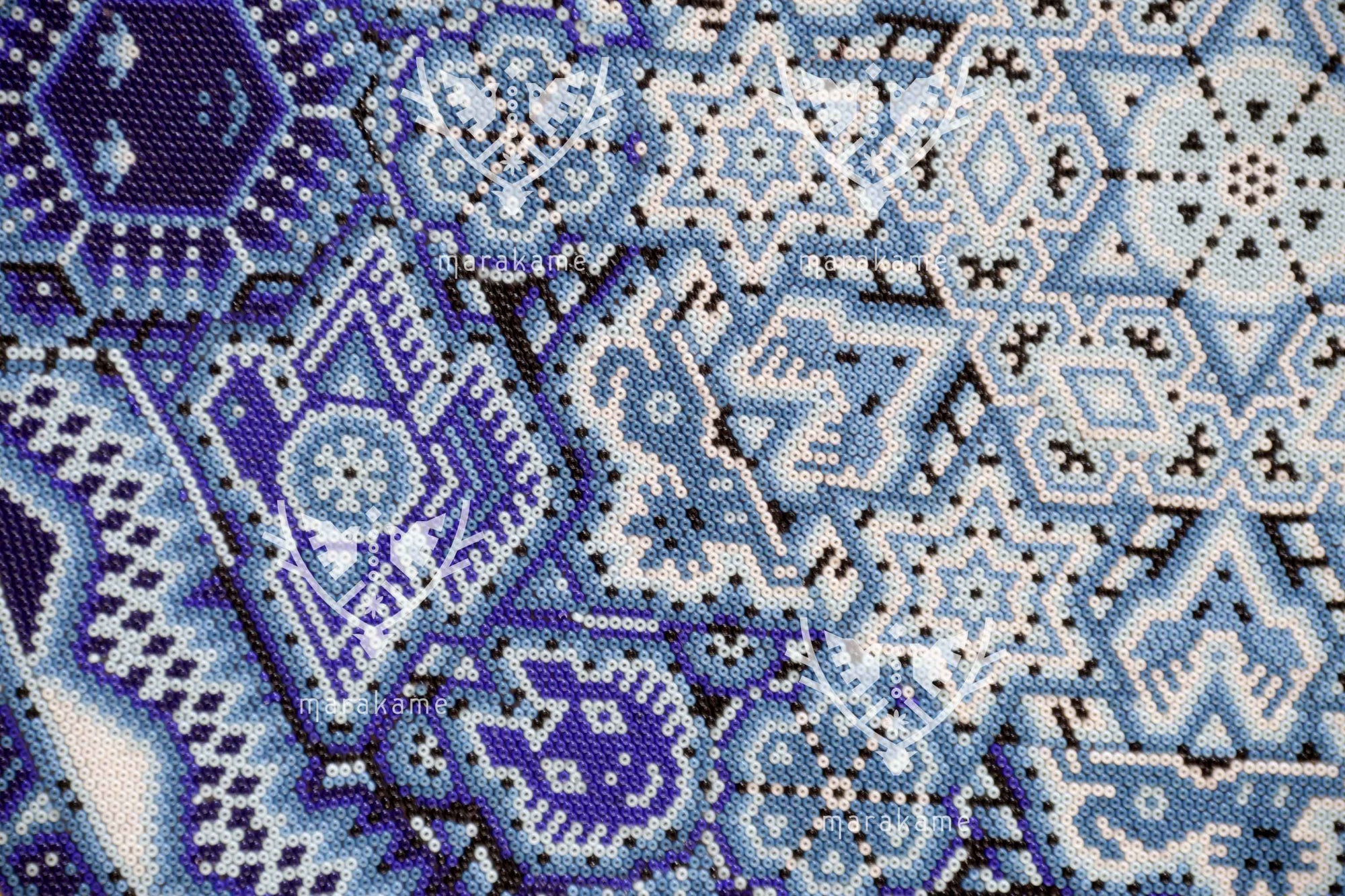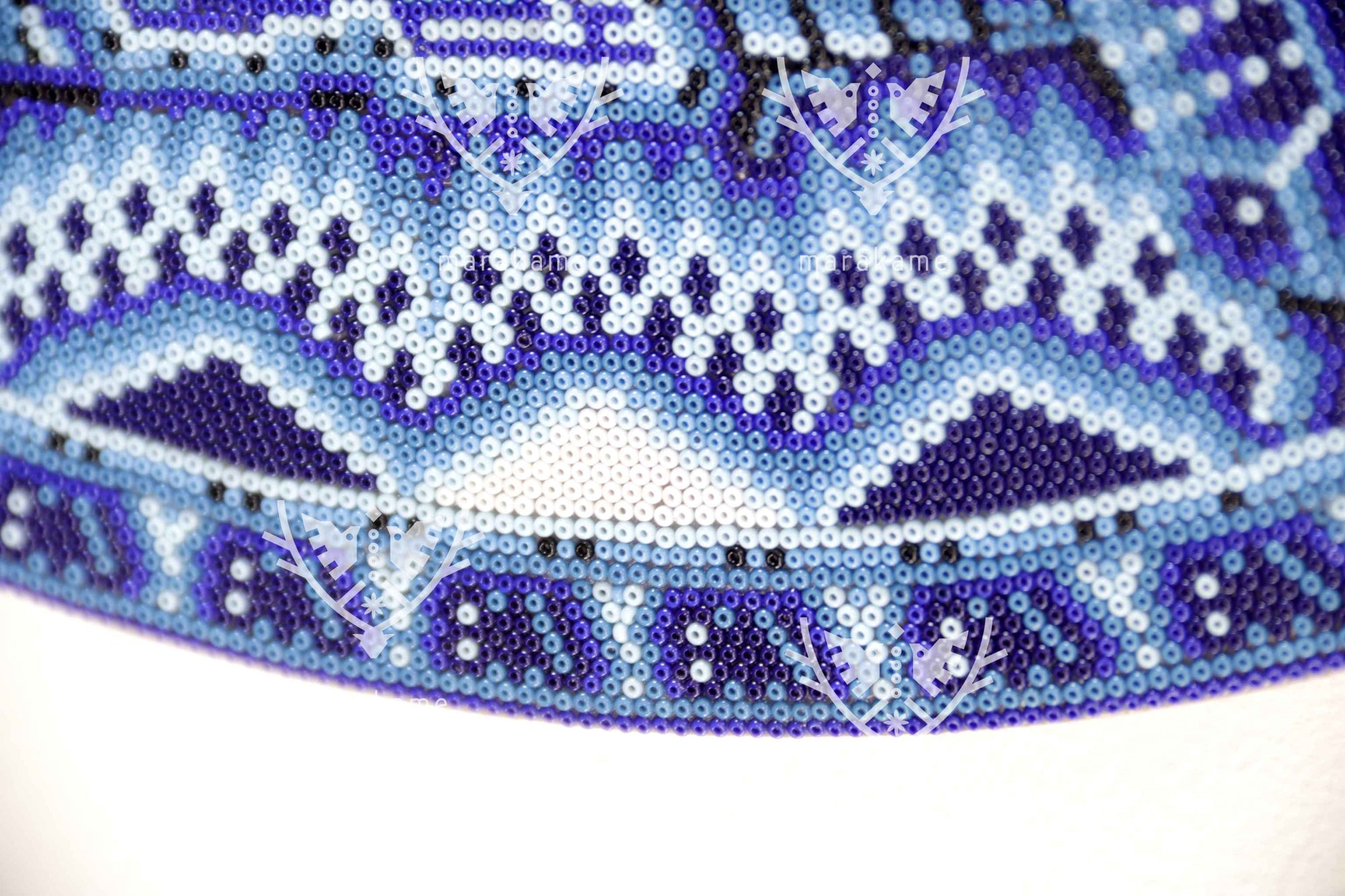 Esta obra excepcional, tejida con paciencia y devoción, es un Nierika huichol circular de 40.3 cm de diámetro, elaborado con micro chaquira de cristal en tonalidades azules. Su diseño minucioso evoca los cantos y plegarias dirigidos a Tatei Nariwame, la madre de la lluvia, deidad sagrada que nutre la tierra y bendice los cultivos.
