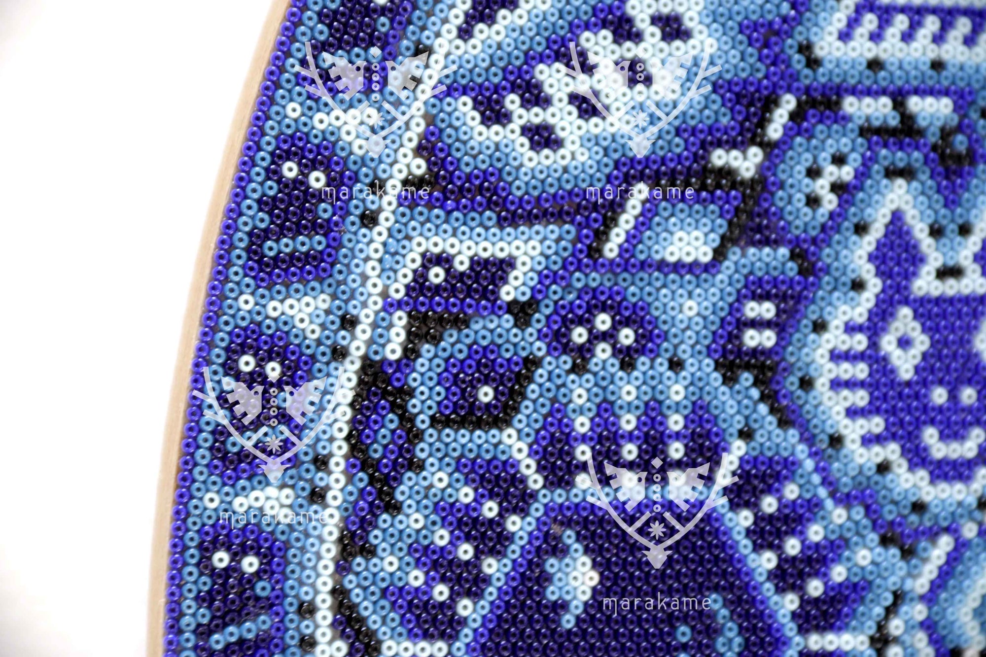 • ◇ Técnica: Micro chaquira de cristal calibrado 13/0 prensada con pegamento epóxico sobre círculo de madera.
