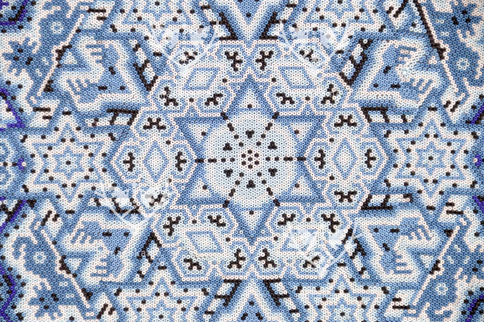 El patrón central de estrellas y espirales representa el flujo del agua y su conexión con el mundo espiritual. Los motivos simétricos que lo rodean simbolizan la visión sagrada (nierika) que el chamán alcanza en su peregrinar, cuando logra entrar en contacto con el corazón del universo.