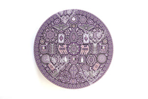 Hecho a mano con chaquira de cristal en tonos morados y metálicos, este círculo está lleno de símbolos que honran el camino del maíz: jícaras que guardan semillas, flechas que protegen la milpa, flores de vida, manos ofrendando, y espíritus animales como el venado y el coyote, guardianes de las cosechas. Todo enmarcado por una geometría que sugiere el ritmo natural de la tierra.