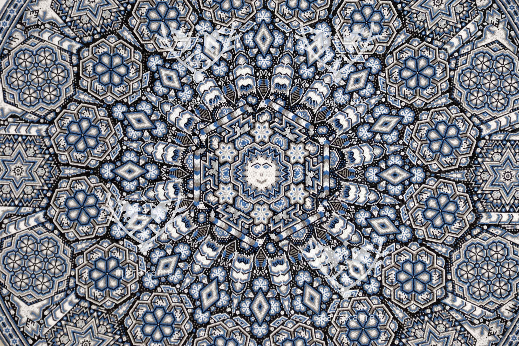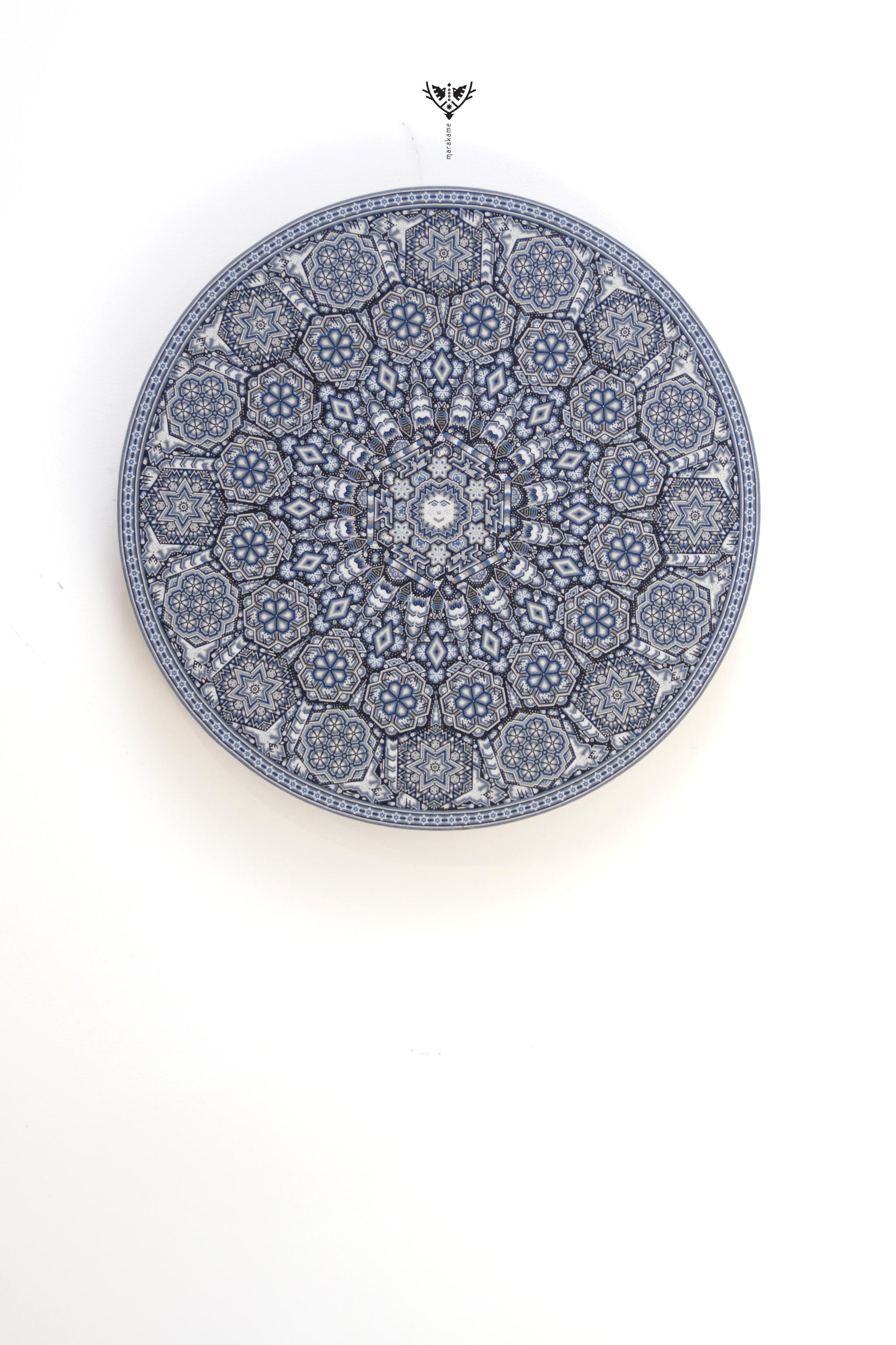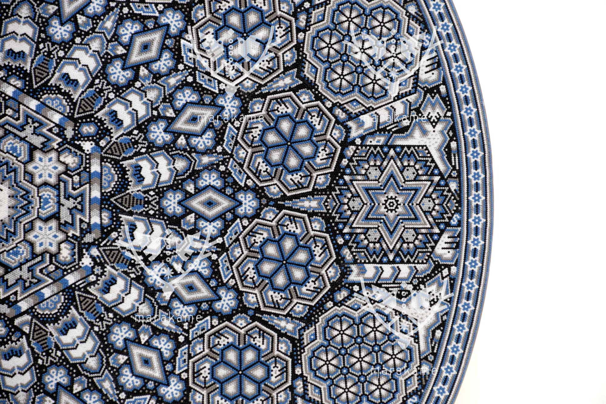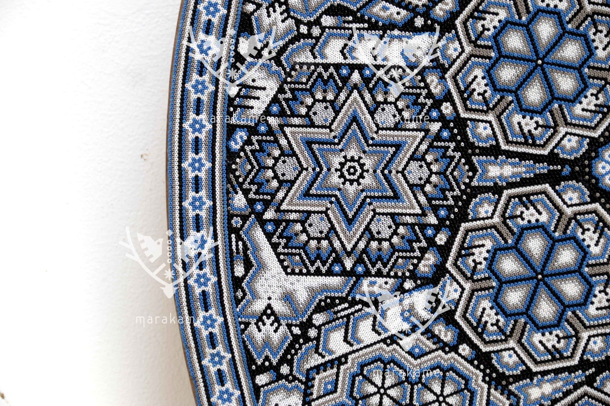 Tau, el Sol, es el núcleo de la vida y la conciencia espiritual para el pueblo wixárika. Esta pieza circular de chaquira representa con deslumbrante precisión la fuerza radiante de Tau como eje cósmico y dador de vida. Cada cuenta de chaquira ha sido colocada meticulosamente a mano para formar una mandala solar que vibra con simetría sagrada.