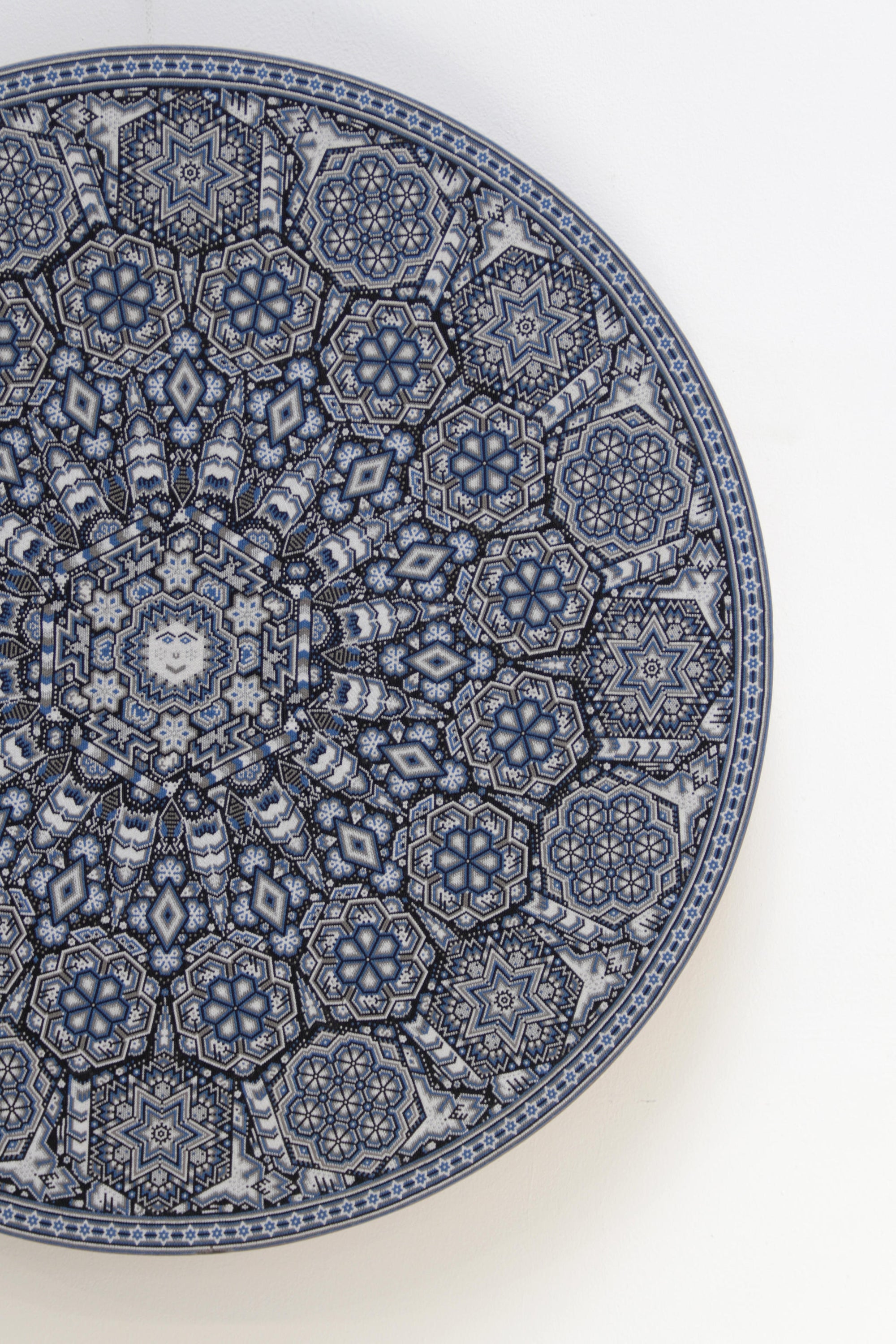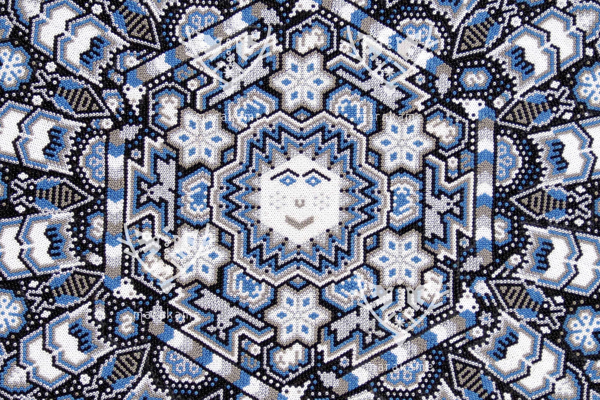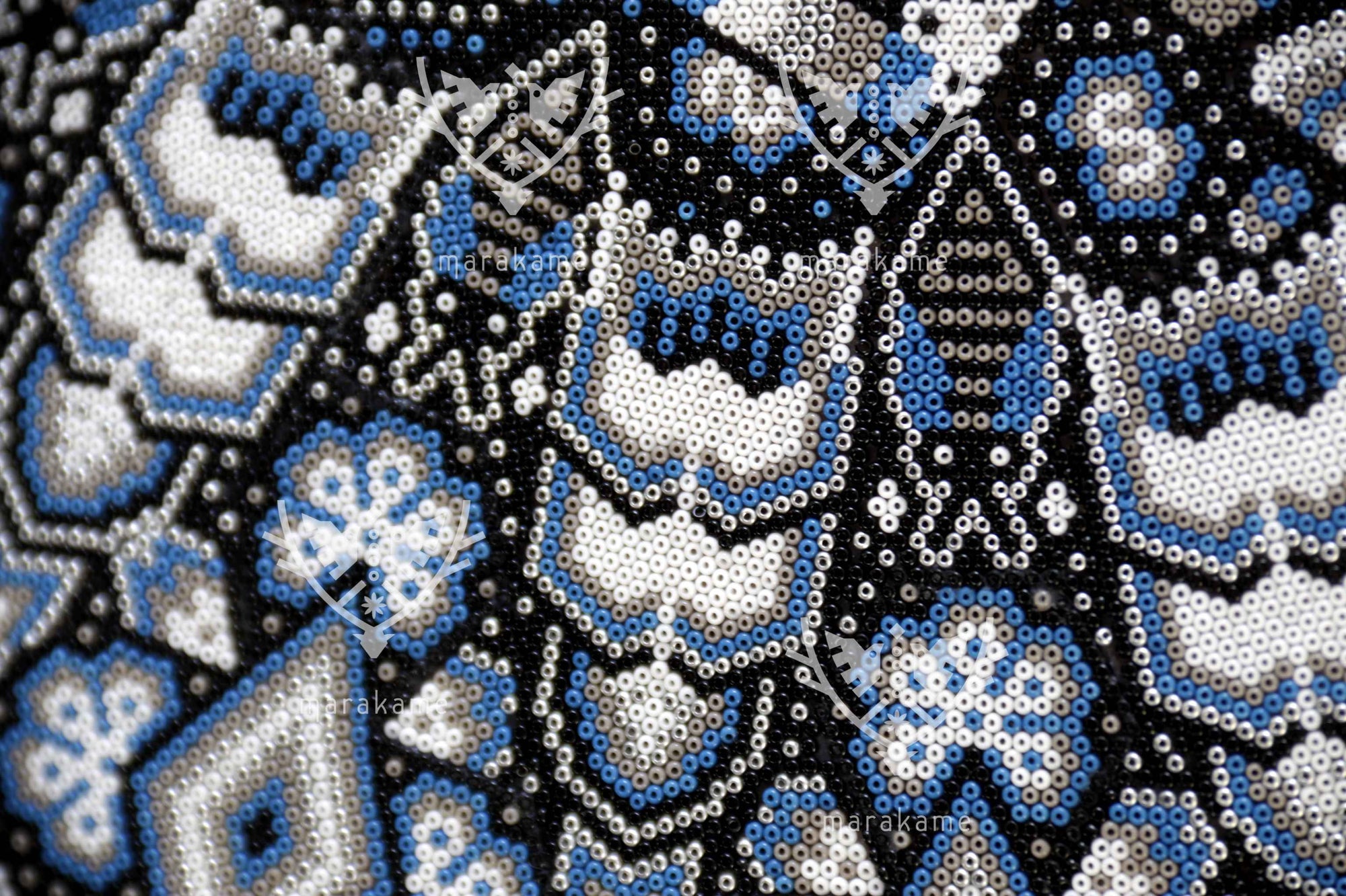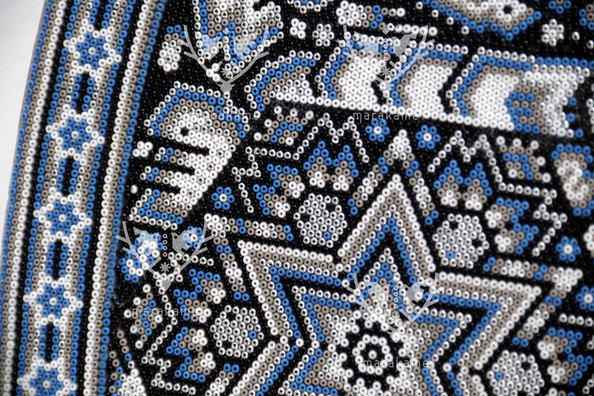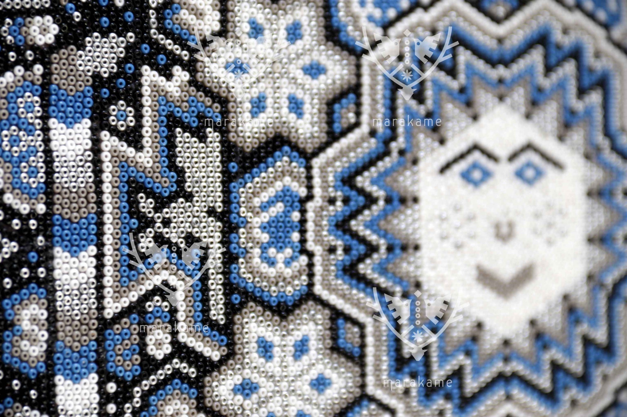Tau, el Sol, es el núcleo de la vida y la conciencia espiritual para el pueblo wixárika. Esta pieza circular de chaquira representa con deslumbrante precisión la fuerza radiante de Tau como eje cósmico y dador de vida. Cada cuenta de chaquira ha sido colocada meticulosamente a mano para formar una mandala solar que vibra con simetría sagrada.