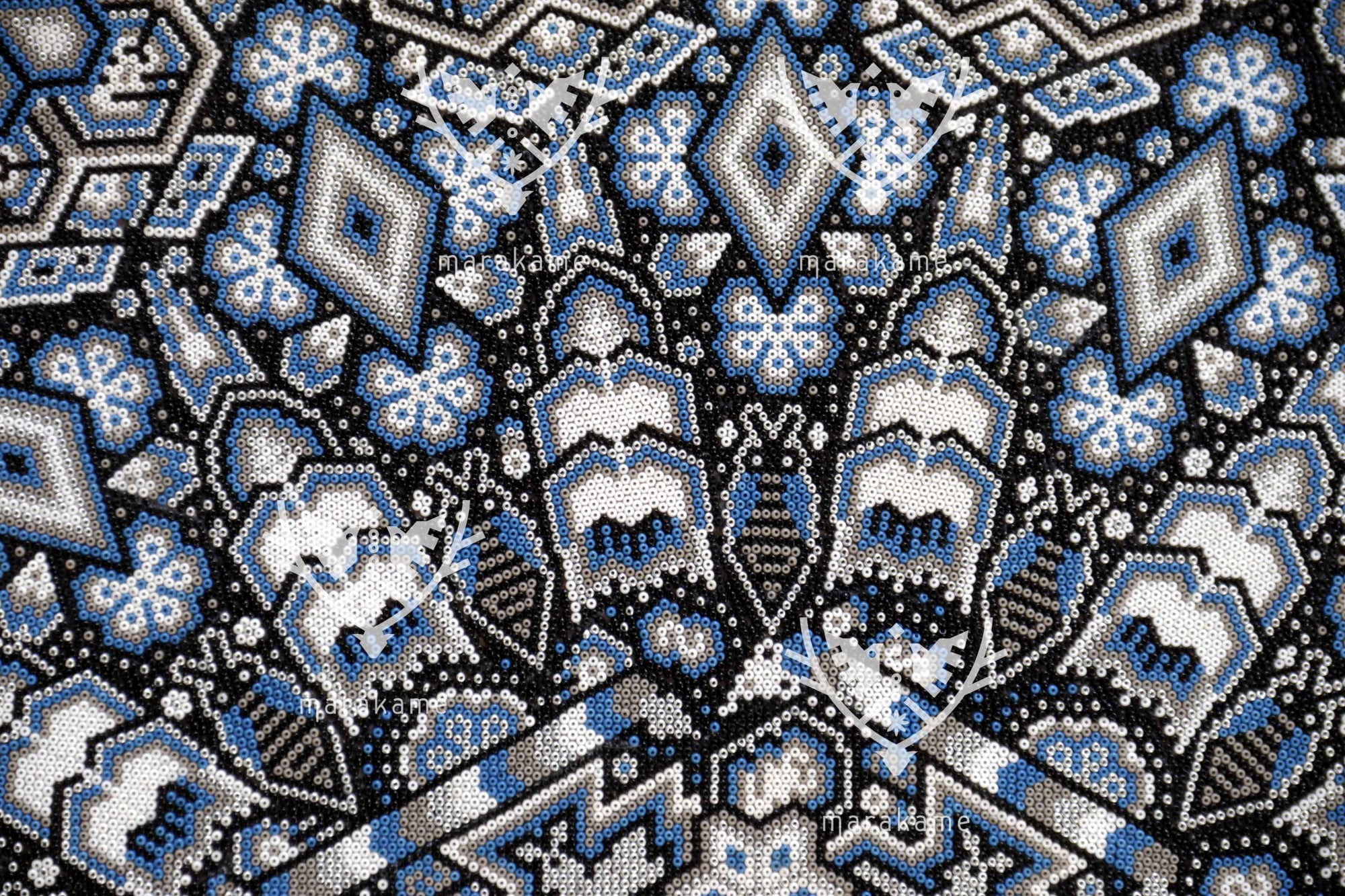 - Más de 180,000 chaquiras prensadas una por una en esta pieza.