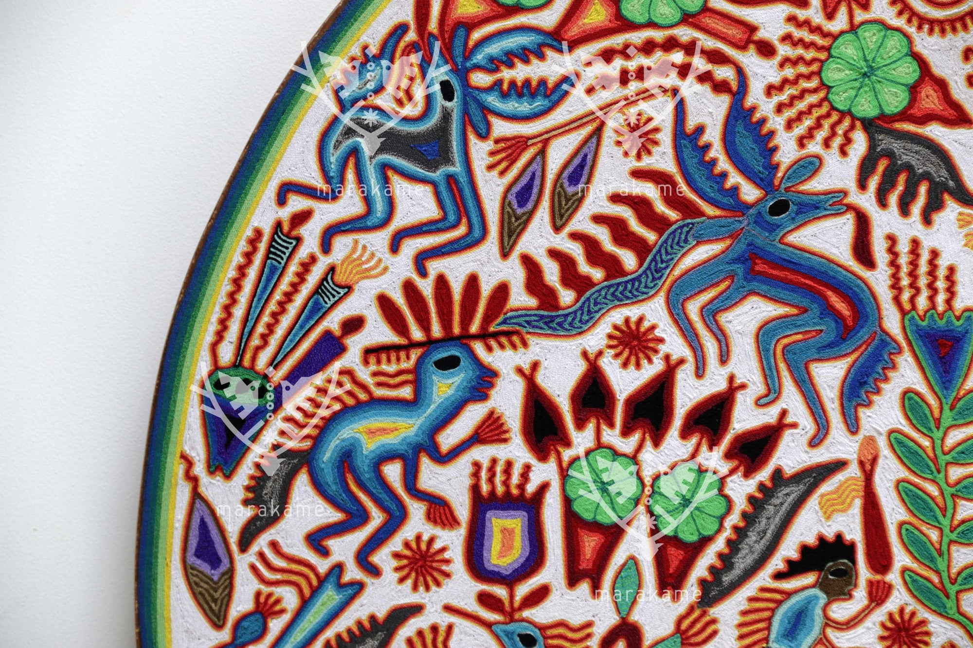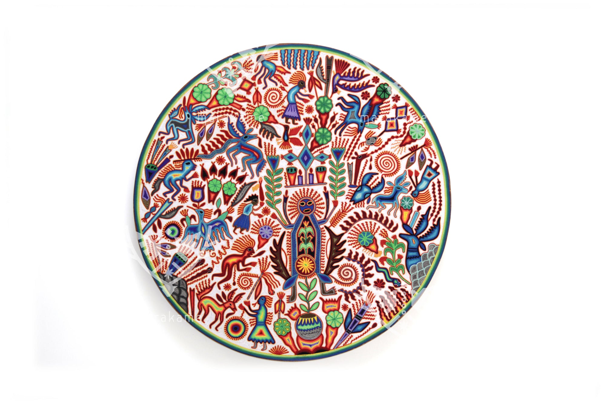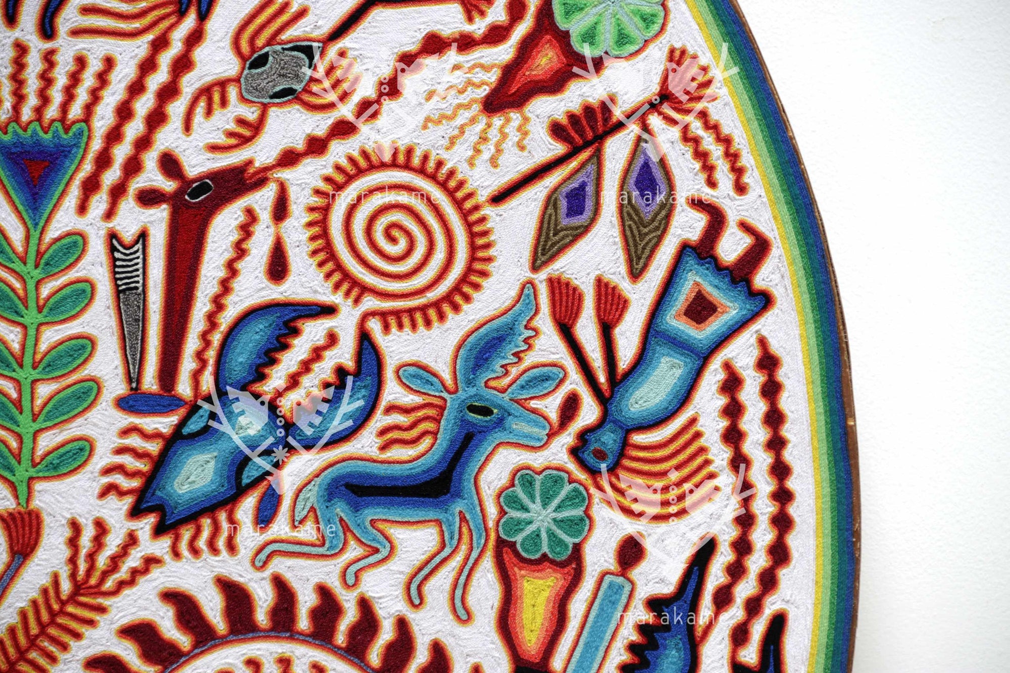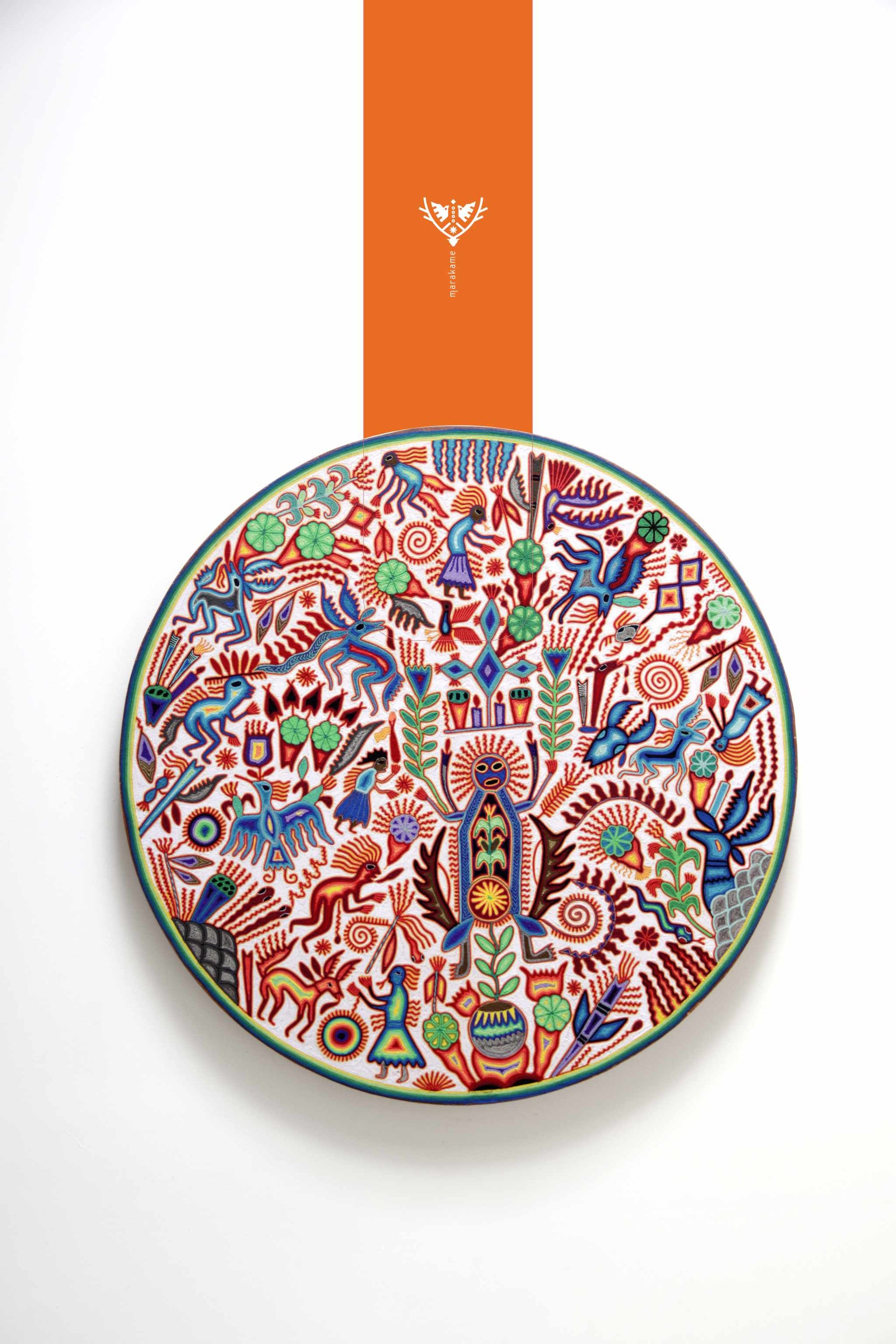 Este nierika circular, tejido con estambre sobre base de cera, representa una escena ceremonial wixárika centrada en el venado azul, mensajero entre el mundo espiritual y los seres humanos. El fondo blanco simboliza pureza y claridad, mientras que los símbolos multicolores relatan el ciclo sagrado de la caza, la ofrenda y la comunión con la naturaleza. En el centro, una figura de poder emerge entre plantas, fuego y estrellas, rodeada de venados, peyotes y elementos del universo espiritual huichol. Cada hilo es un rezo visual que conecta tradición, visión y arte.