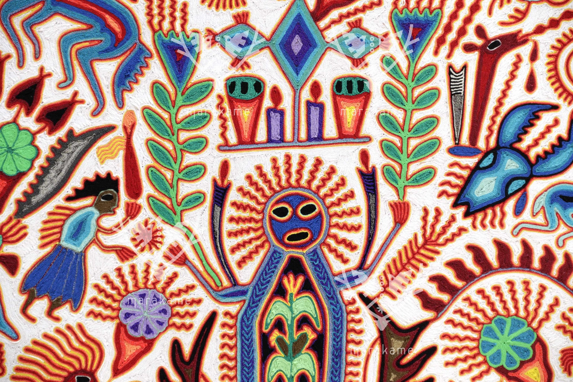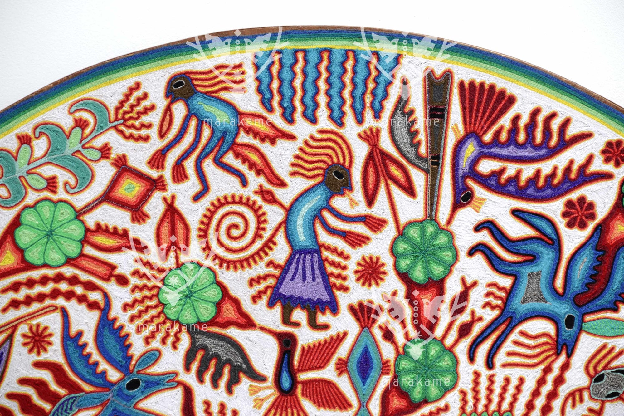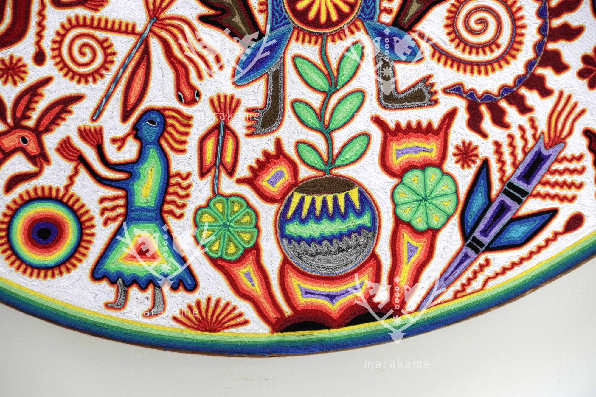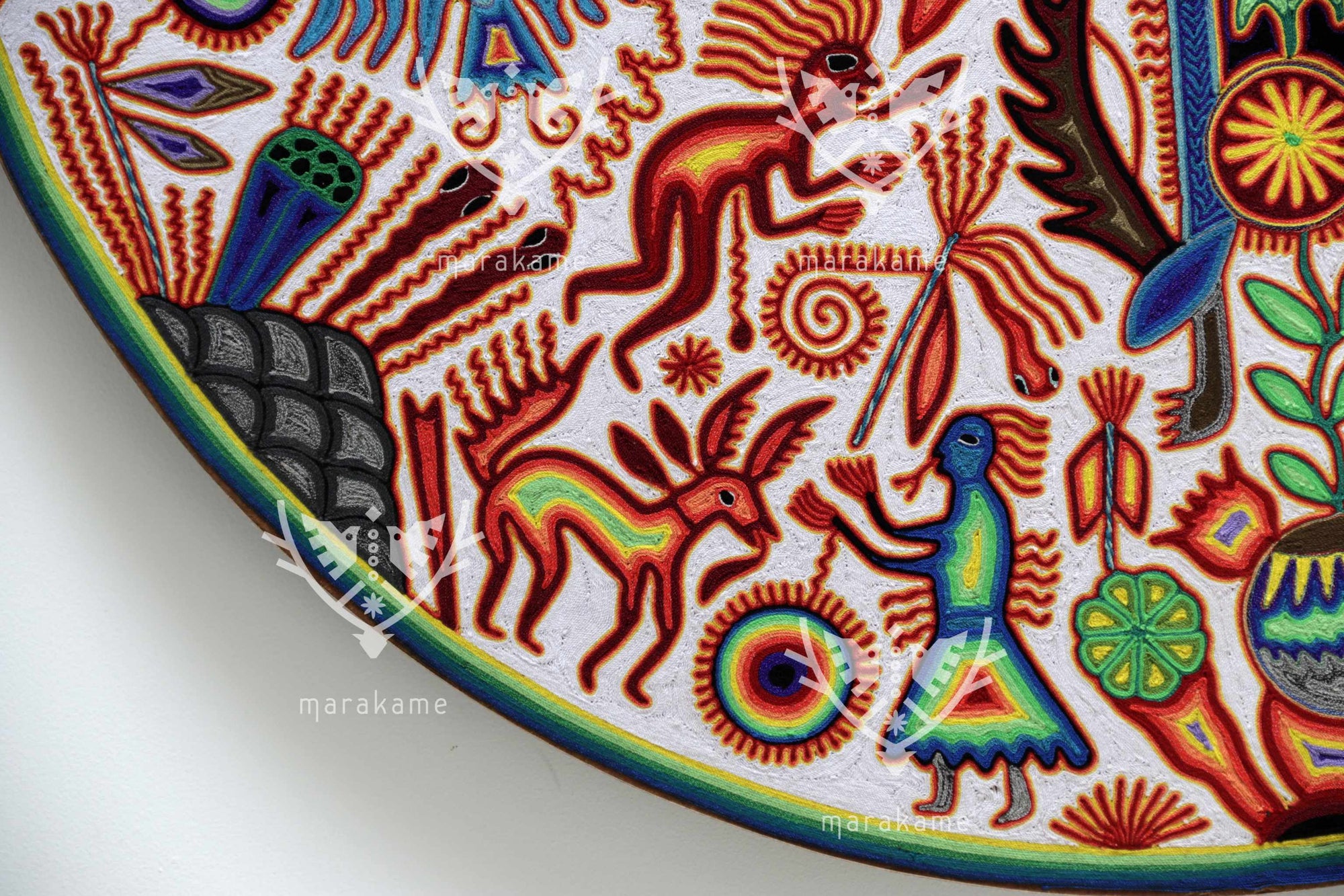 Este nierika circular, tejido con estambre sobre base de cera, representa una escena ceremonial wixárika centrada en el venado azul, mensajero entre el mundo espiritual y los seres humanos. El fondo blanco simboliza pureza y claridad, mientras que los símbolos multicolores relatan el ciclo sagrado de la caza, la ofrenda y la comunión con la naturaleza. En el centro, una figura de poder emerge entre plantas, fuego y estrellas, rodeada de venados, peyotes y elementos del universo espiritual huichol. Cada hilo es un rezo visual que conecta tradición, visión y arte.