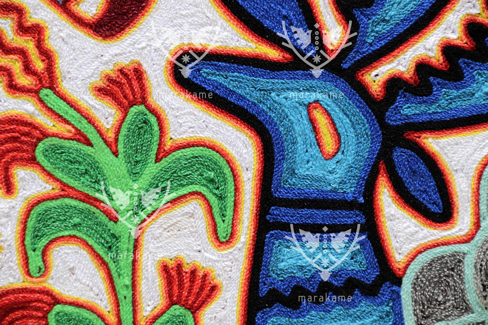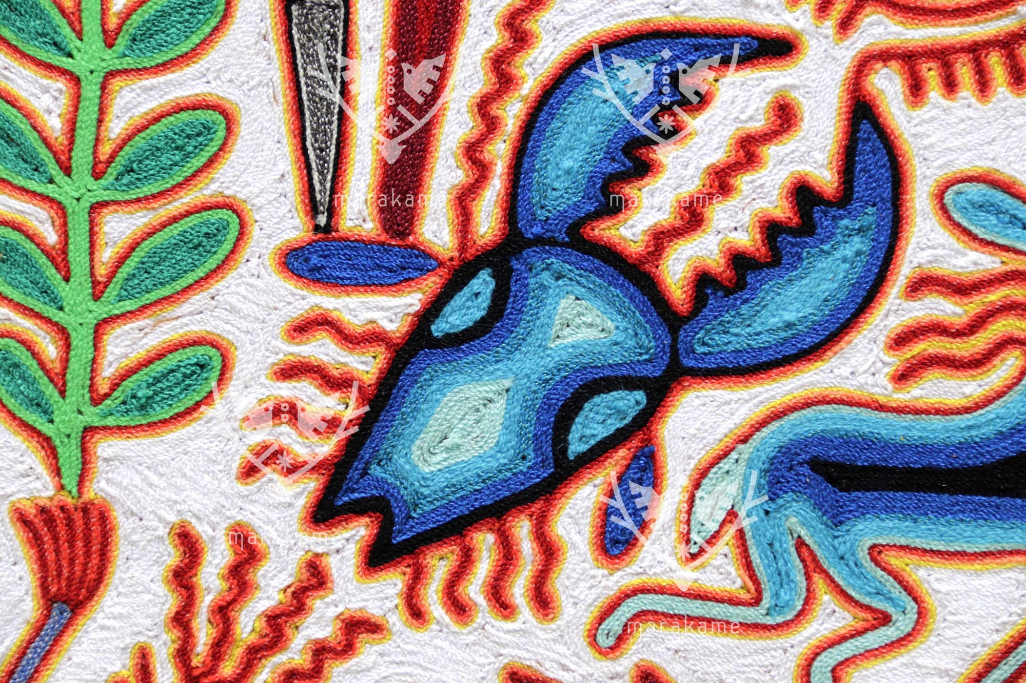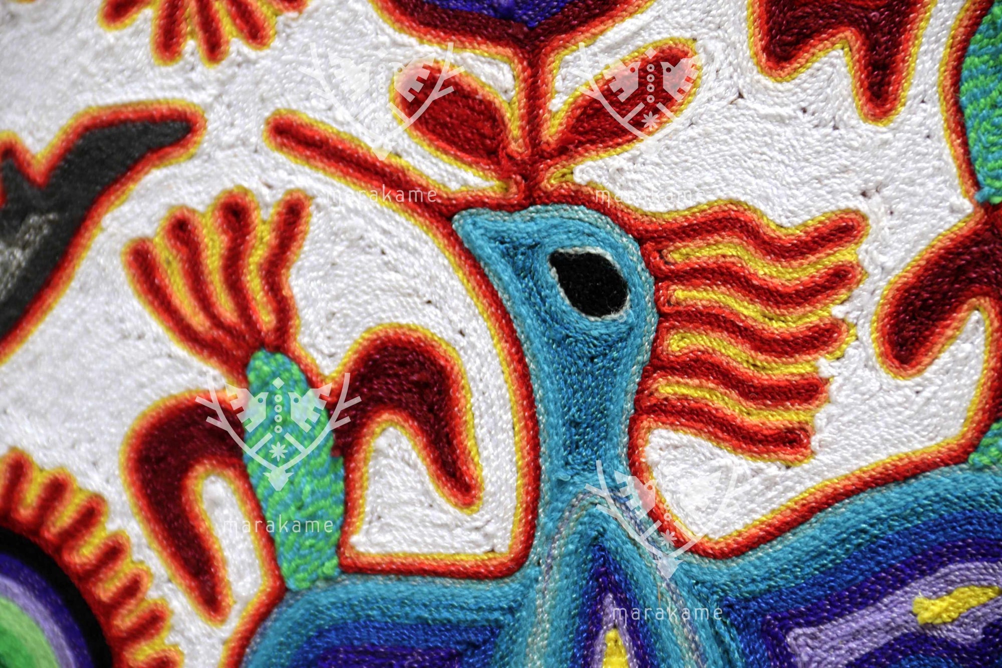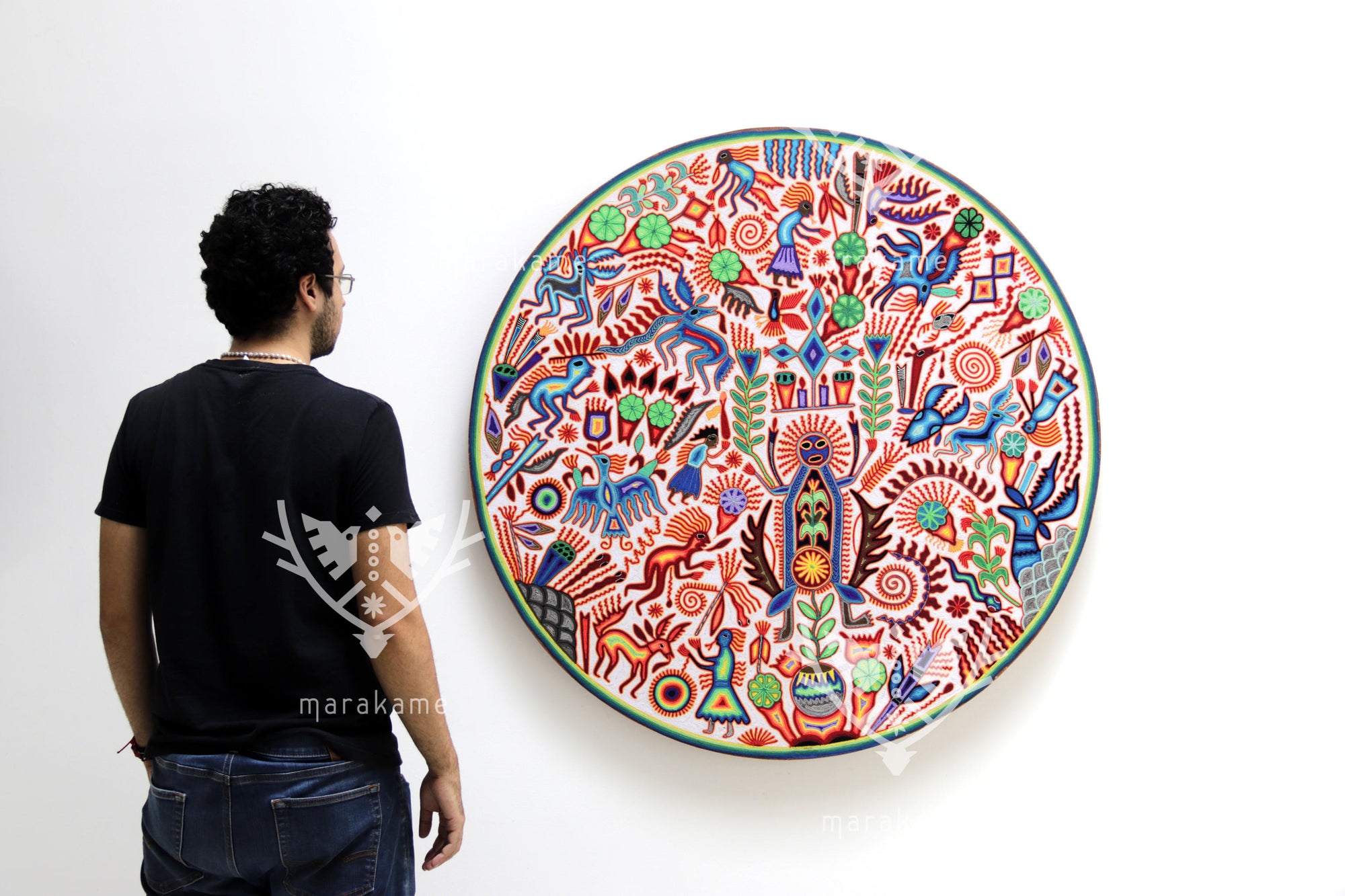 Este nierika circular, tejido con estambre sobre base de cera, representa una escena ceremonial wixárika centrada en el venado azul, mensajero entre el mundo espiritual y los seres humanos. El fondo blanco simboliza pureza y claridad, mientras que los símbolos multicolores relatan el ciclo sagrado de la caza, la ofrenda y la comunión con la naturaleza. En el centro, una figura de poder emerge entre plantas, fuego y estrellas, rodeada de venados, peyotes y elementos del universo espiritual huichol. Cada hilo es un rezo visual que conecta tradición, visión y arte.