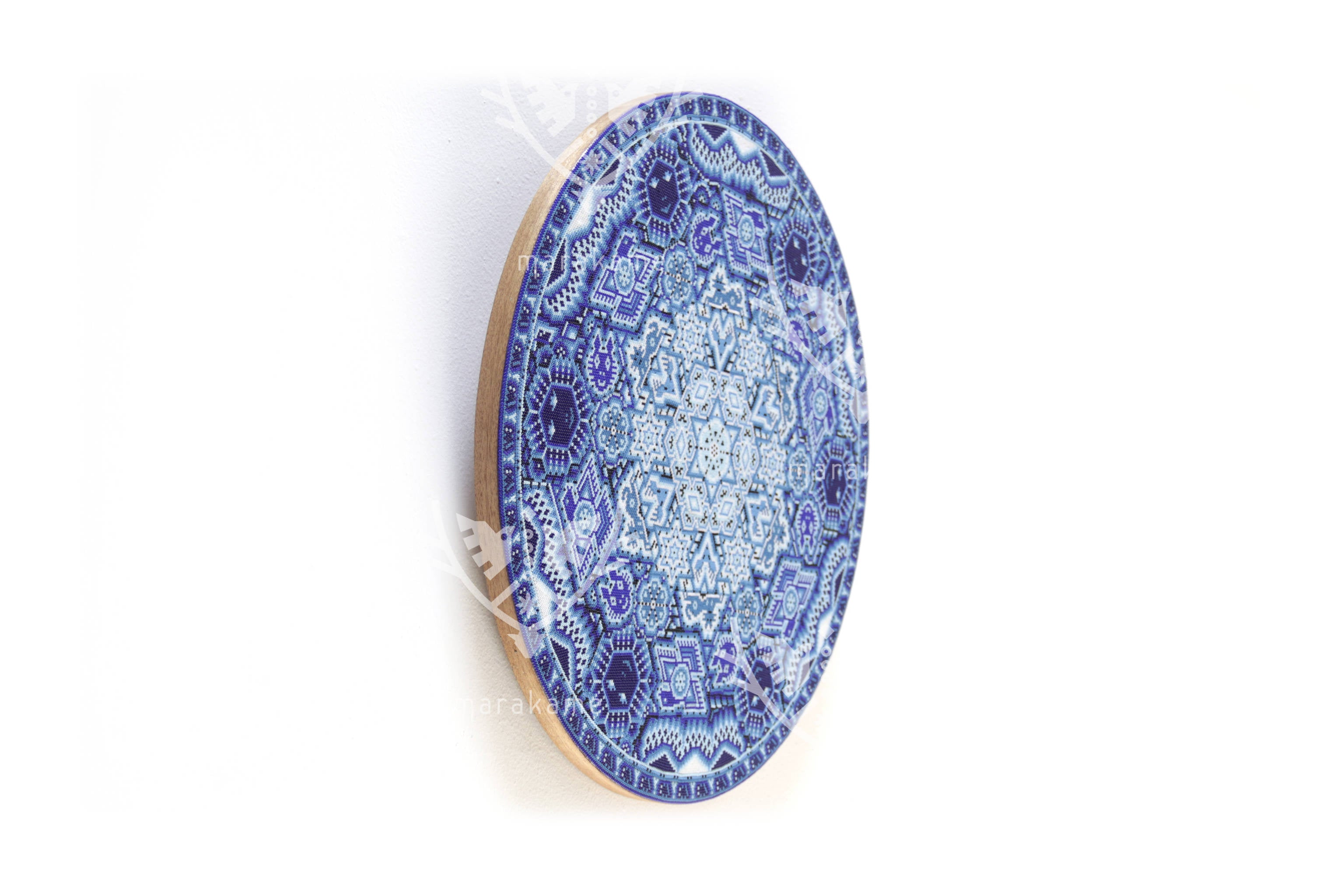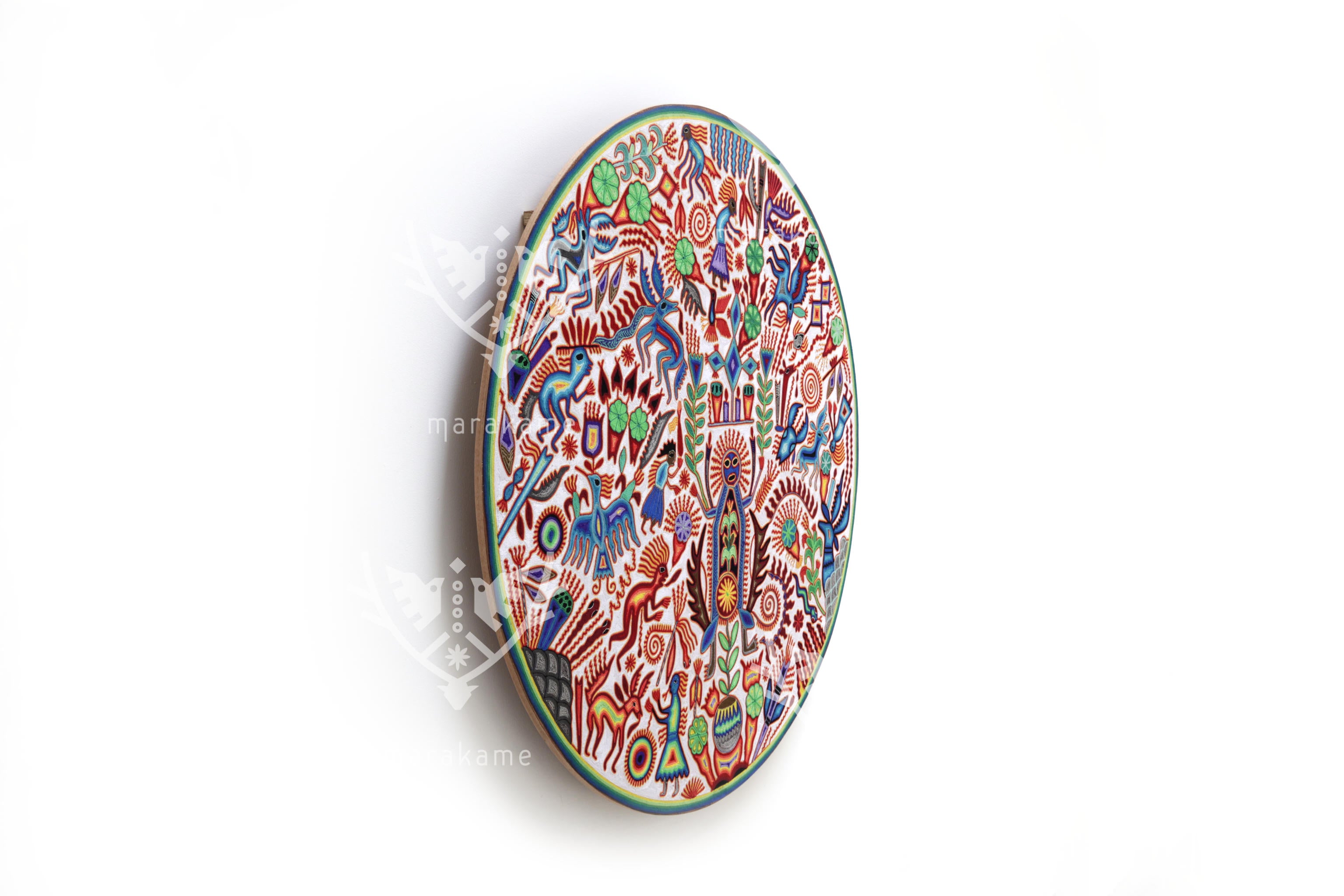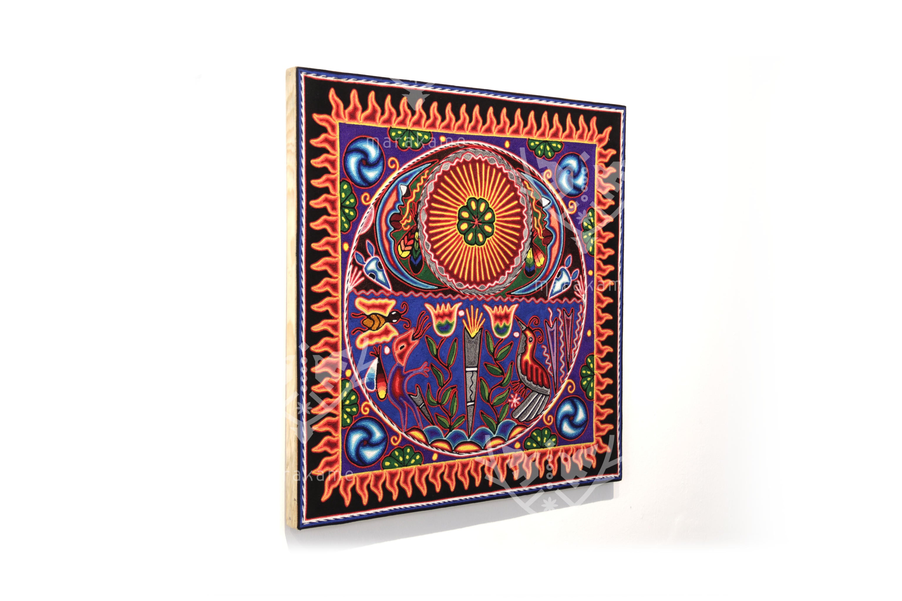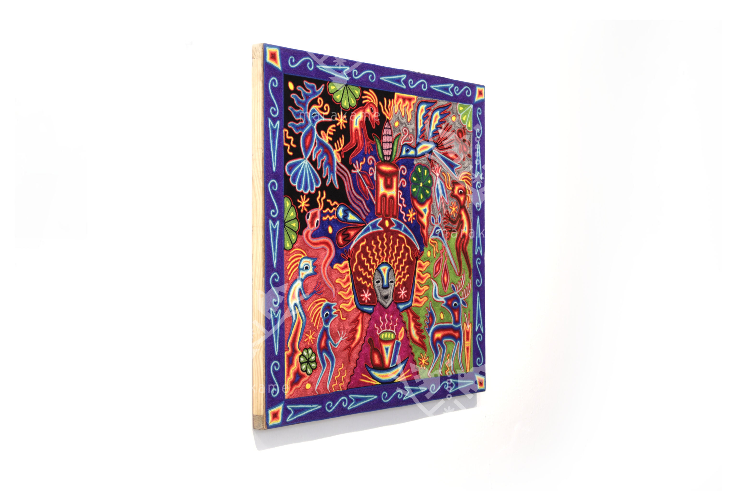 Cada hilo fue colocado a mano sobre una base de cera y madera, convirtiendo esta obra en una expresión sagrada del pueblo wixárika y en una pieza de colección con profundo valor espiritual y estético.