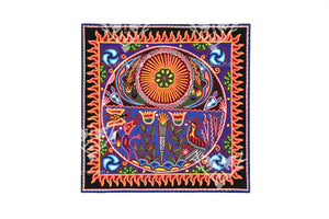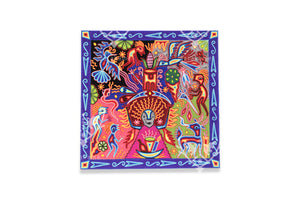 Este impresionante nierika de estambre huichol representa una conexión ceremonial con Tatewari, el abuelo fuego, guía espiritual de los marakate (chamanes). En el centro, se despliegan escenas simbólicas de transformación, fertilidad y sanación: el venado azul, el peyote (hikuri), el maíz y el águila como mensajera divina.