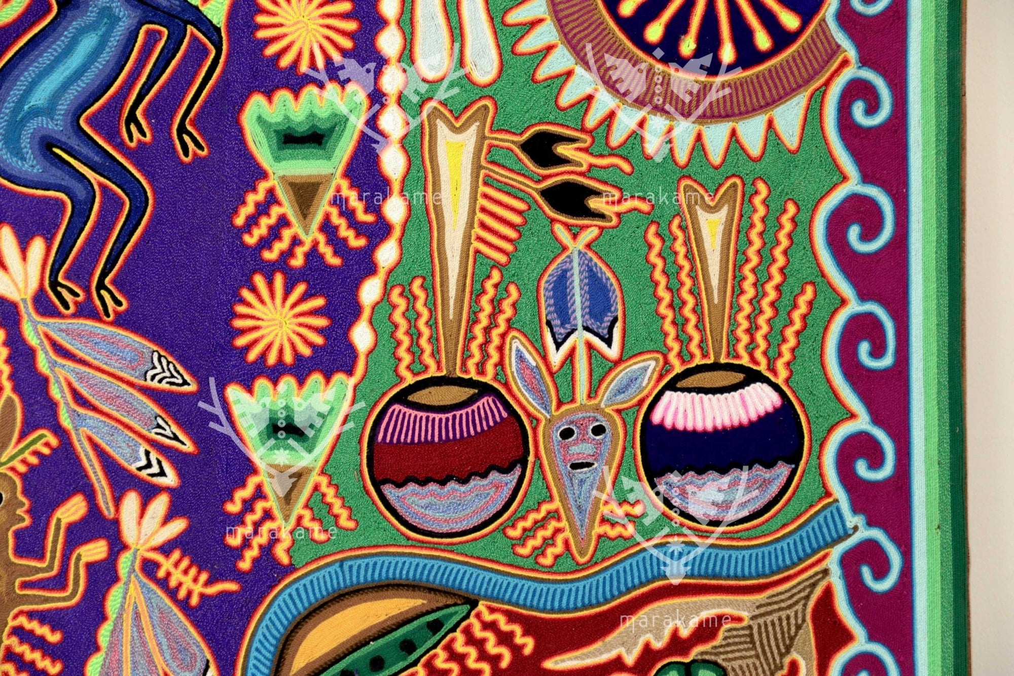 En Marakame trabajamos con cinco artistas Wixaritari -huicholes- que elaboran piezas especialmente de gran formato con la antigua técnica de "Pintado con Estambre", decidimos comisionar a los artistas obras de hasta 6 m2 de superficie -siendo estas las más grandes en el mundo en su estilo y técnica-, desde el estilo antiguo hasta representaciones más realistas, según el estilo pictórico de cada creador, en cualquier caso abordando la narrativa de su costumbre tradicional mediante la simbología más representativa de su cosmovisión.