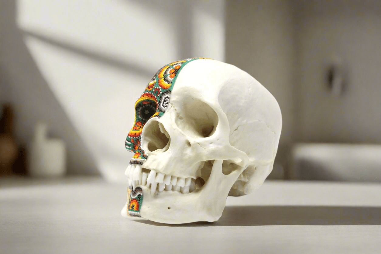 Este cráneo de humano es un verdadero tesoro natural, decorado solo por la mitad vertical del cráneo con chaquiras de colores naturales y vivos que reflejan la belleza y la complejidad de la vida. La parte lateral del cráneo está cubierta de una serie de patrones y diseños vistosos que invitan a la contemplación y evocan el espíritu humano. La otra mitad del cráneo se deja descubierta, revelando el color natural y blanco como hueso, creando un contraste interesante entre lo decorado y lo natural.