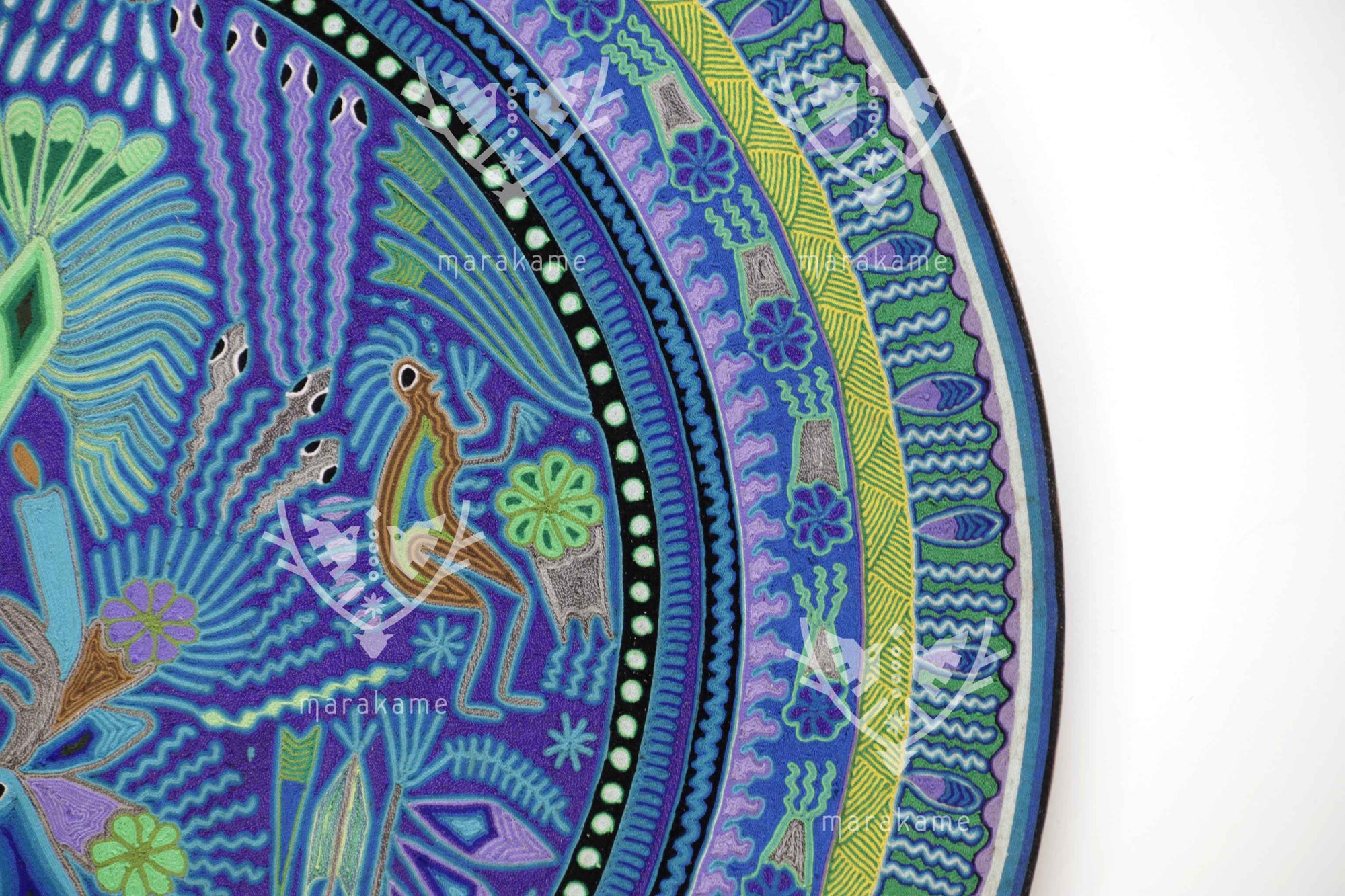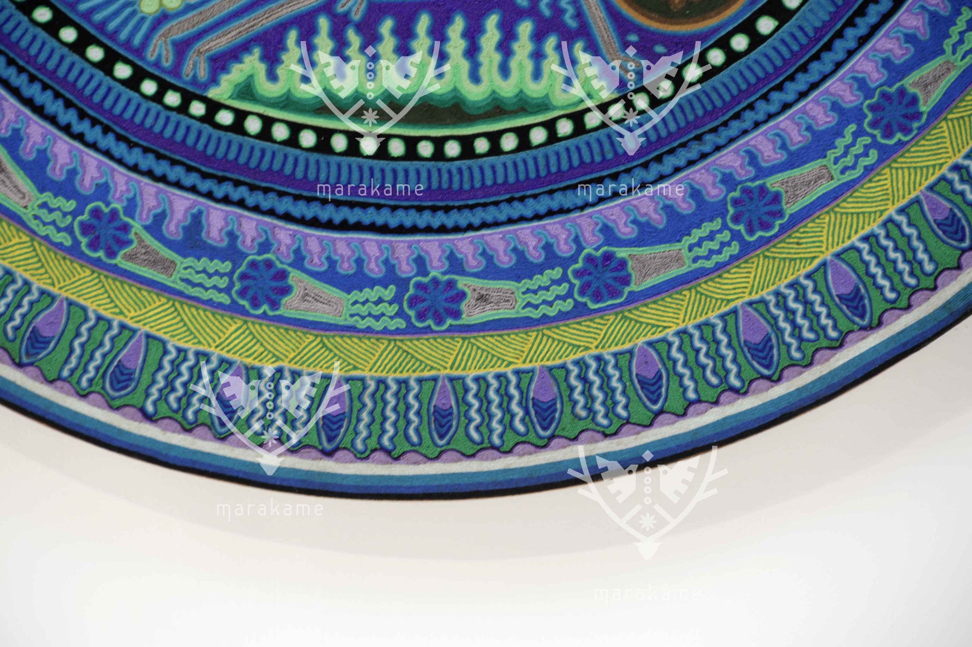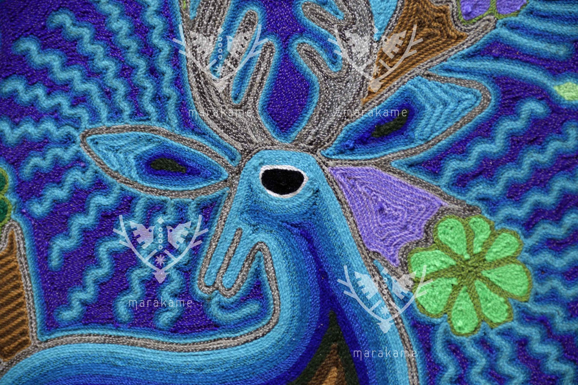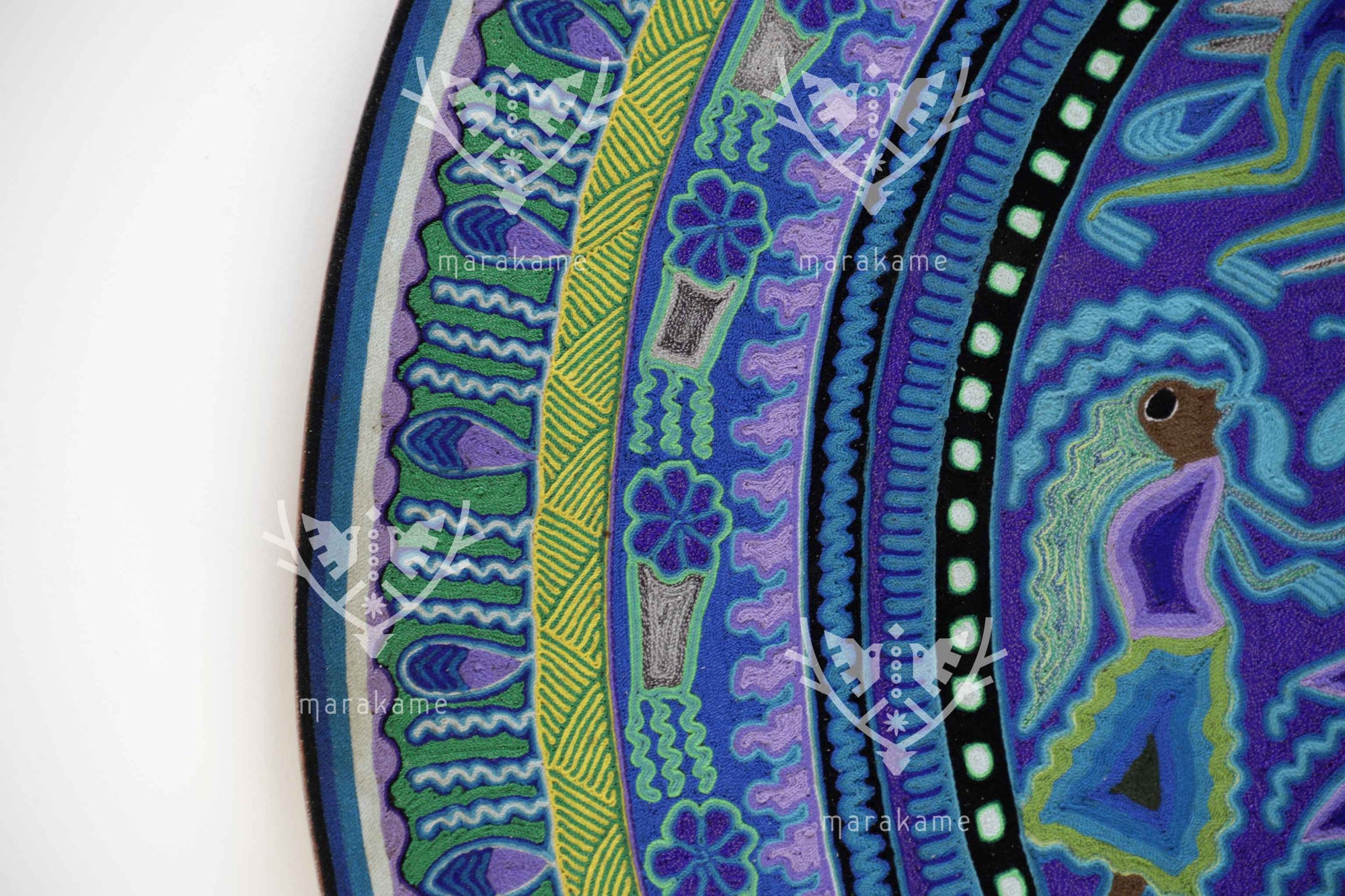Los tonos azules y violetas dominan esta obra, evocando la energía del mundo espiritual y el viaje chamánico. Cada línea de estambre colocada meticulosamente sobre cera y madera narra la relación del ser humano con la naturaleza y el mundo de los dioses.
