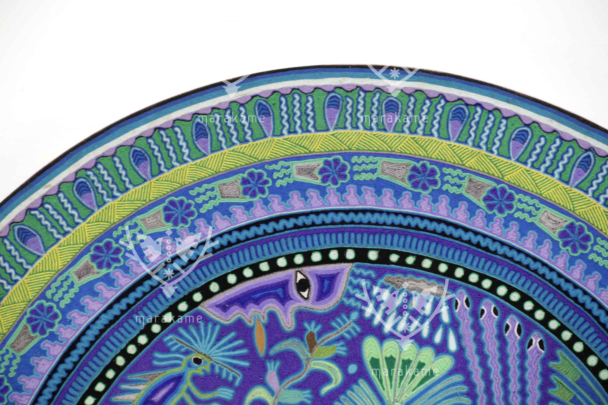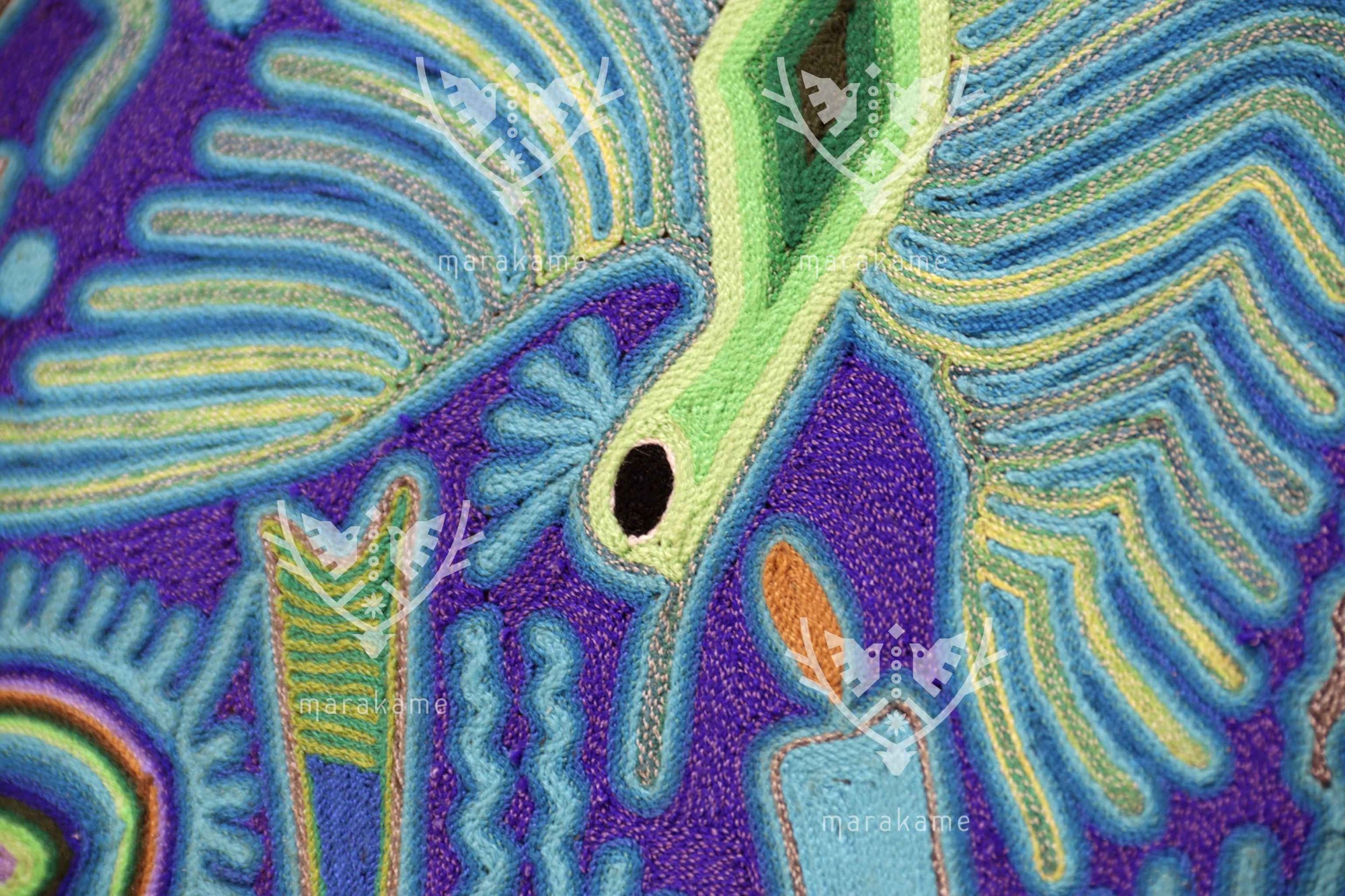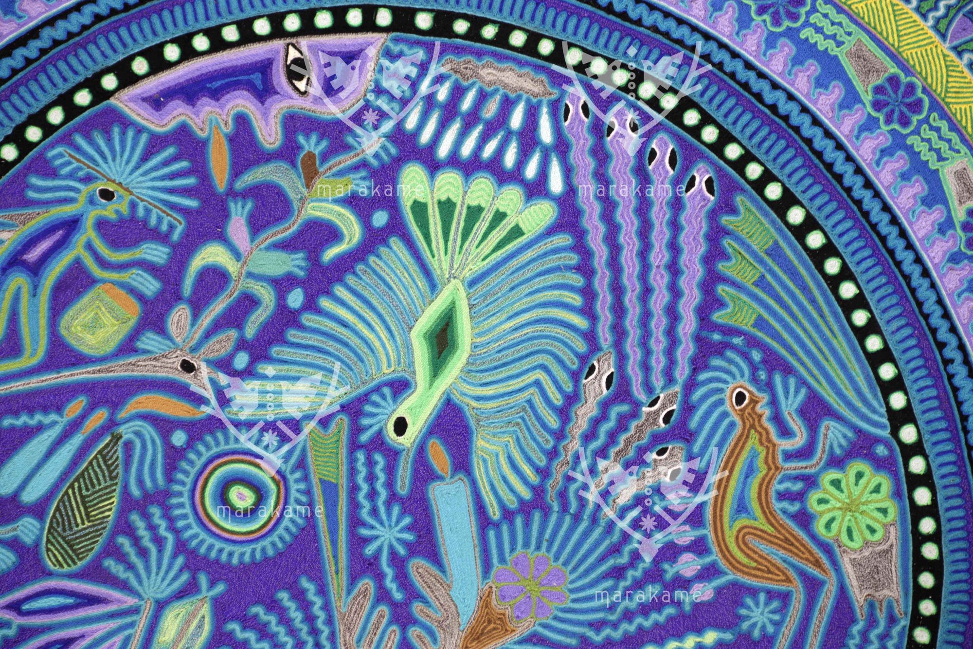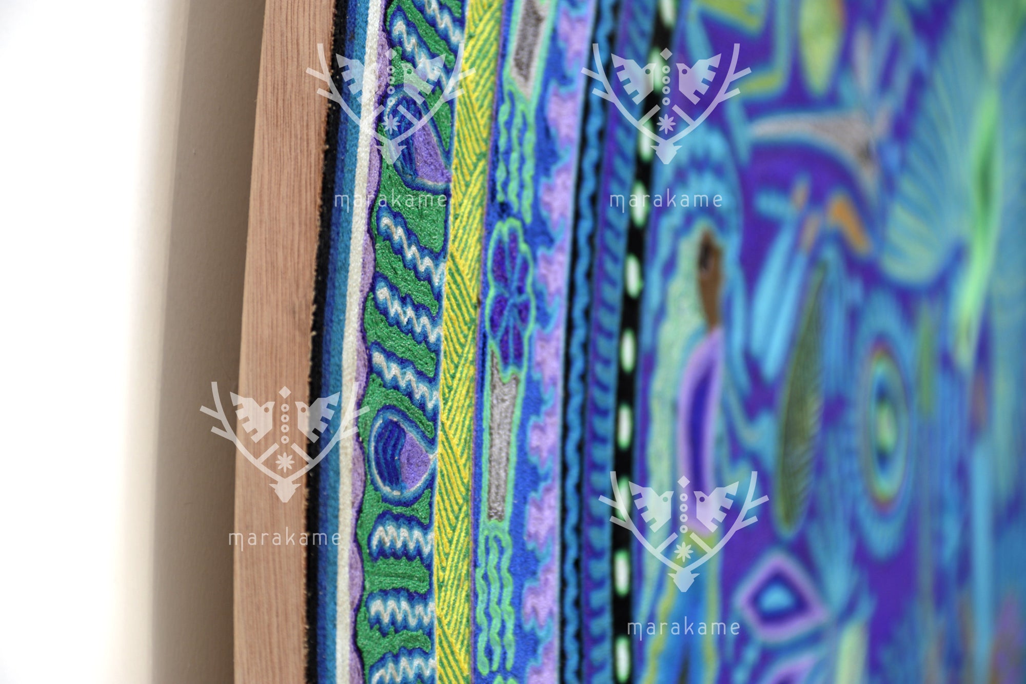 Los tonos azules y violetas dominan esta obra, evocando la energía del mundo espiritual y el viaje chamánico. Cada línea de estambre colocada meticulosamente sobre cera y madera narra la relación del ser humano con la naturaleza y el mundo de los dioses.
