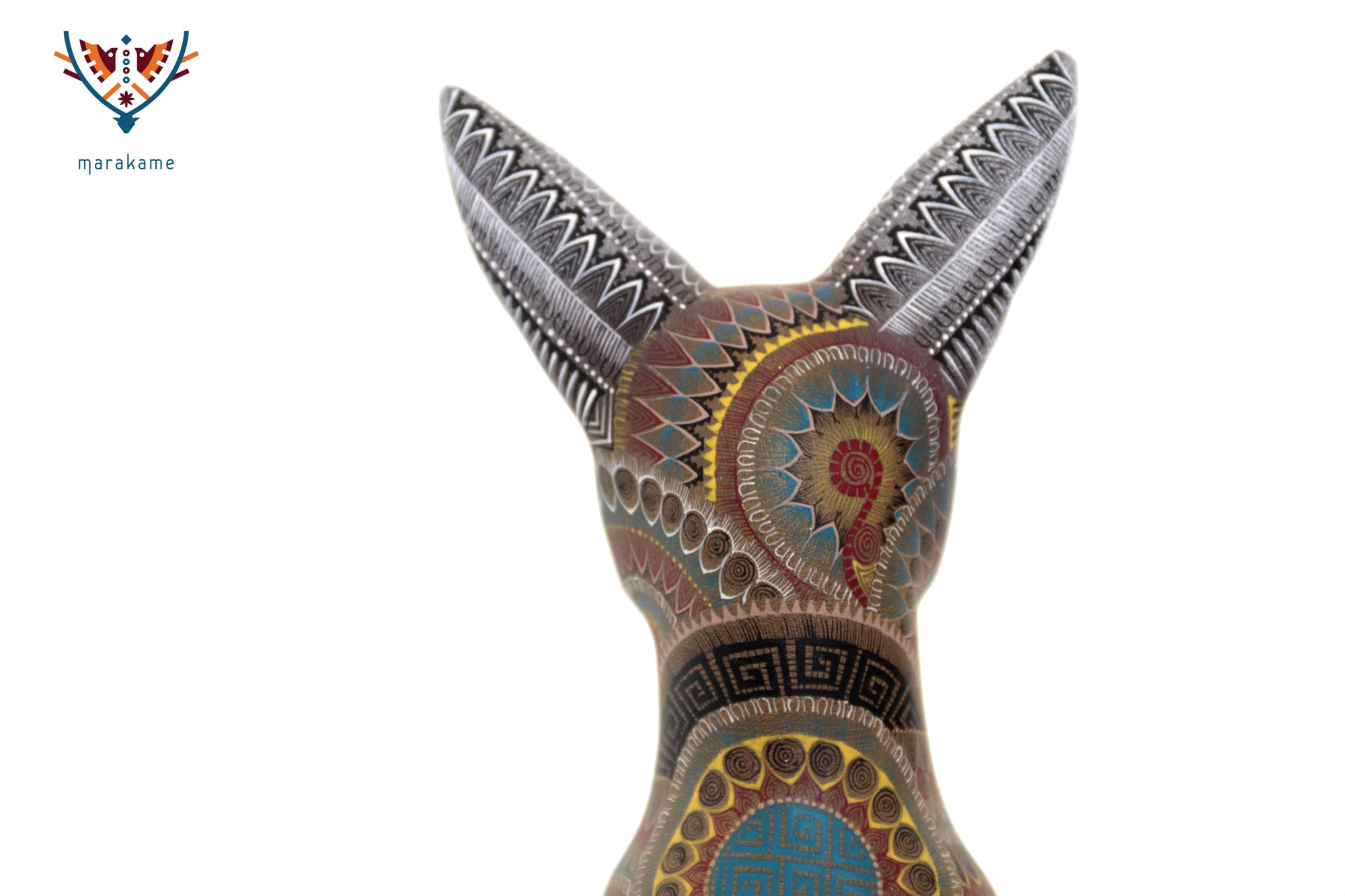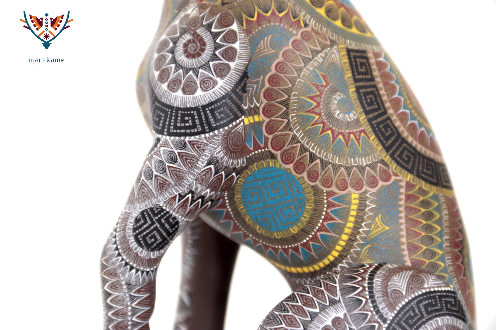 Su postura erguida transmite serenidad y alerta simultáneamente, como si custodiara un umbral invisible. La superficie está cubierta por intrincados patrones geométricos y simbólicos que evocan mapas cósmicos, ciclos vitales y caminos espirituales. Cada trazo, ejecutado con precisión ritual, convierte la pieza en una narrativa visual que se despliega orgánicamente sobre la forma escultórica.