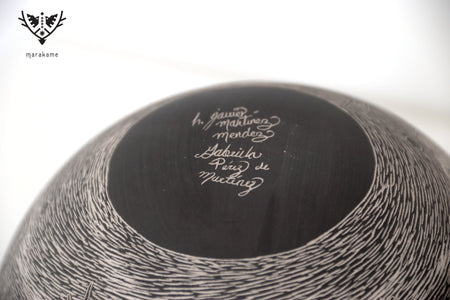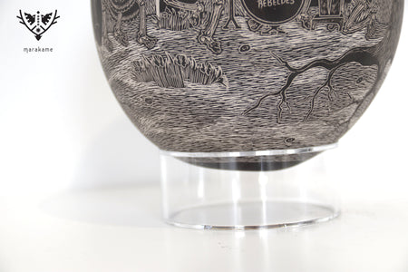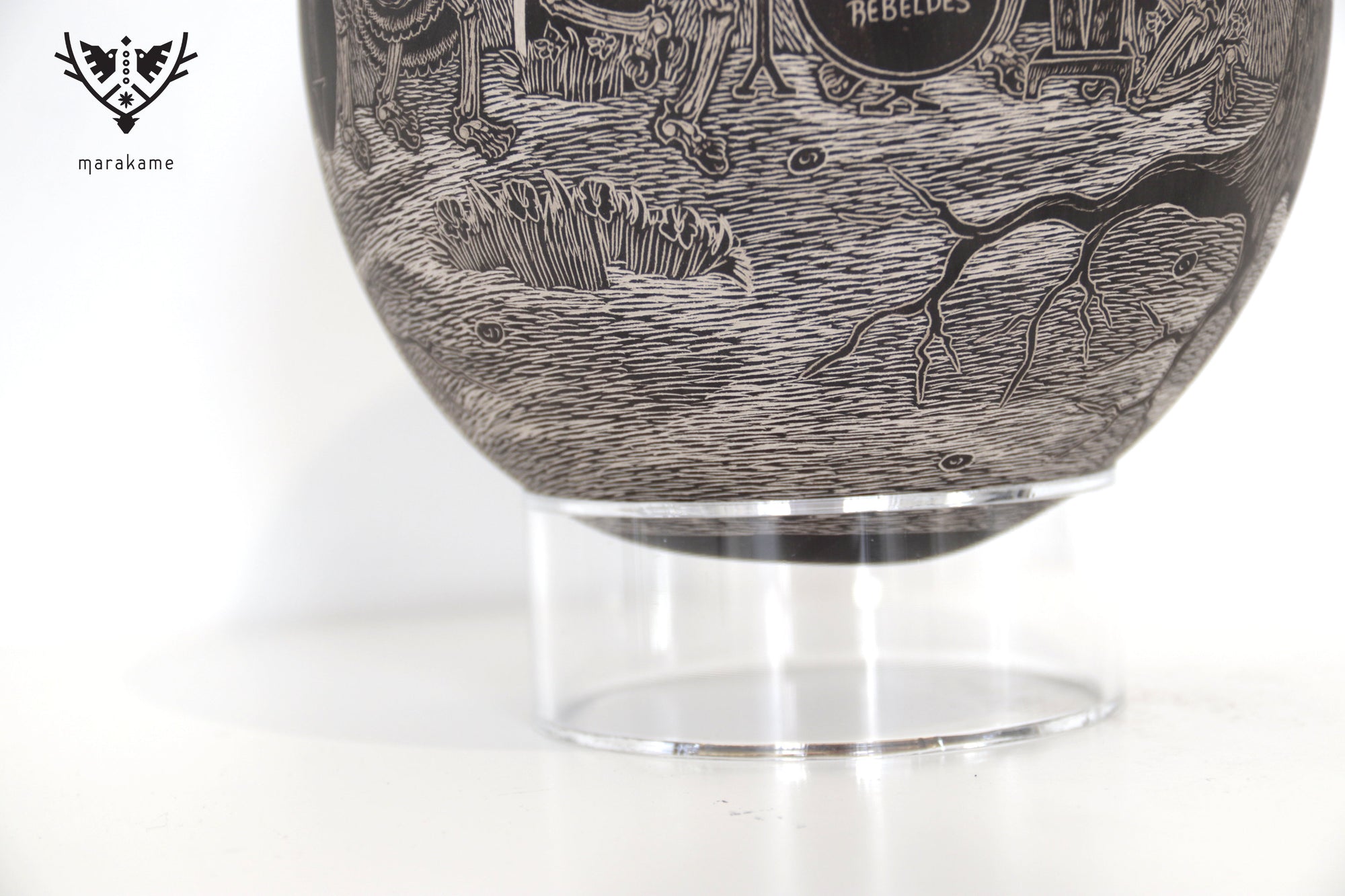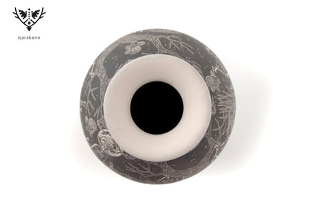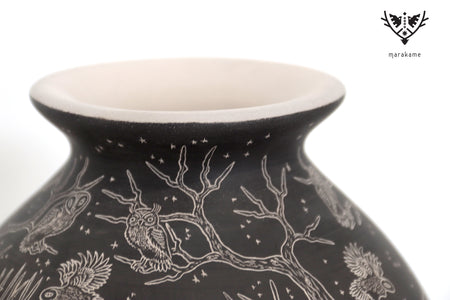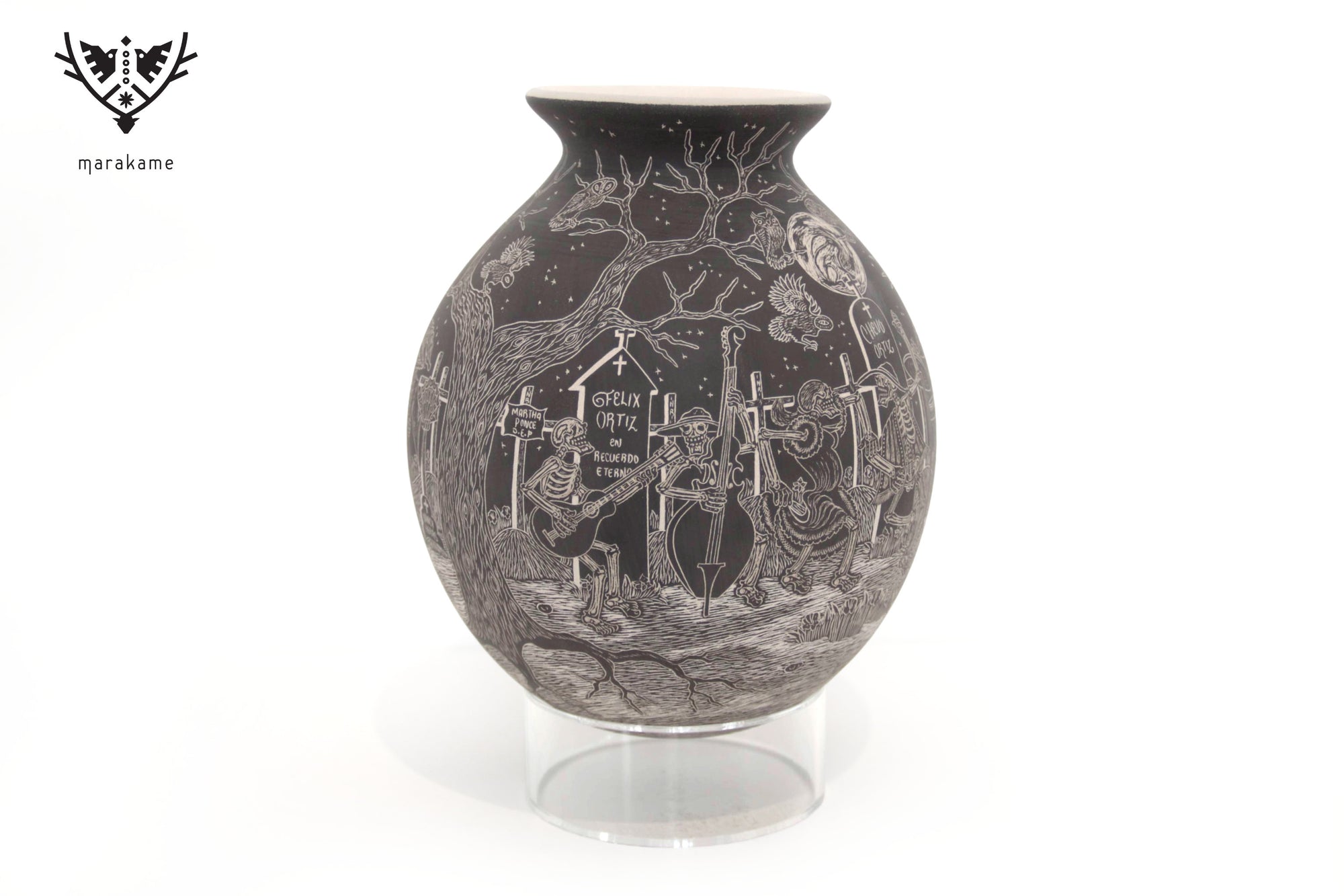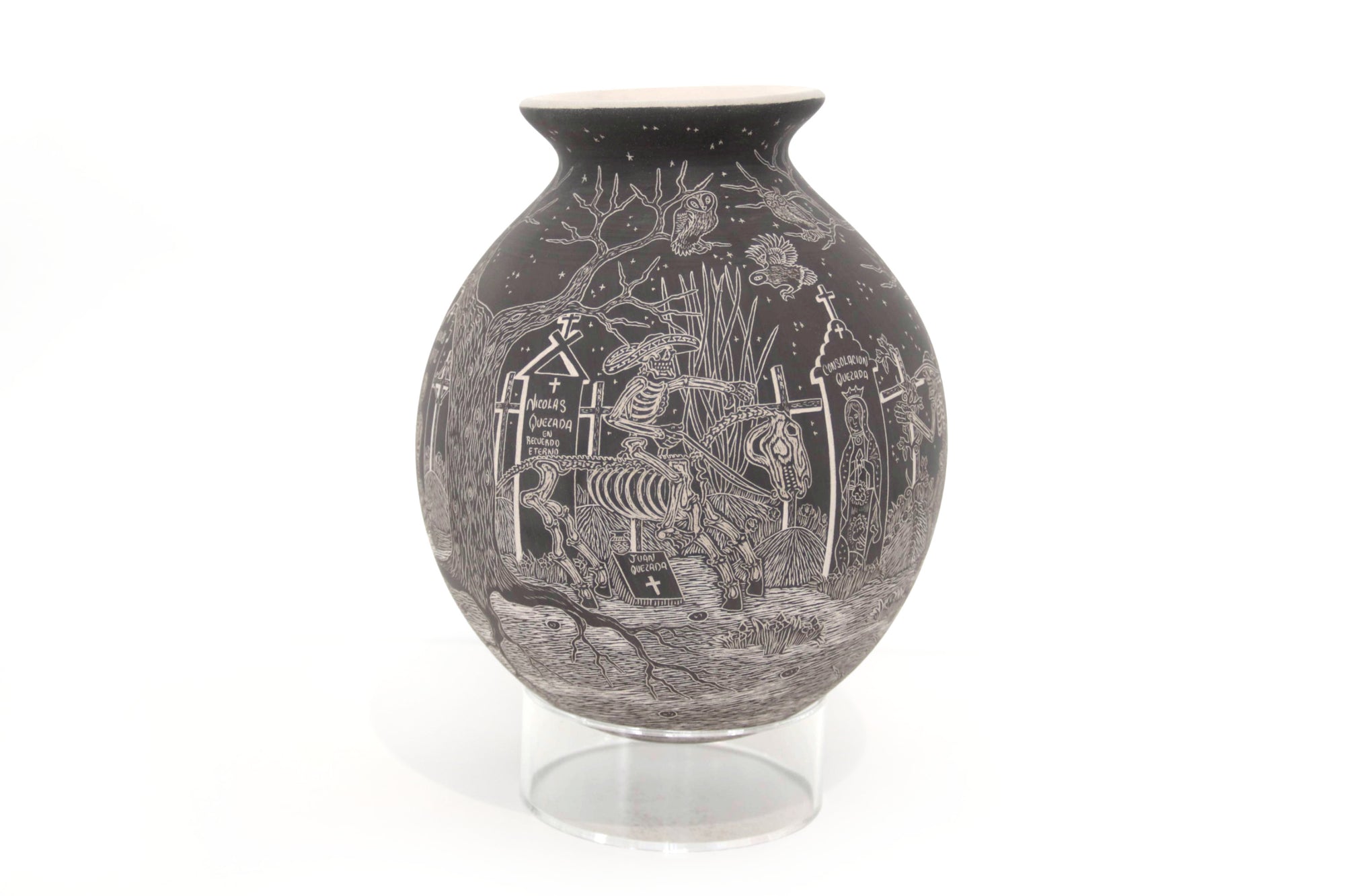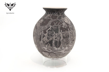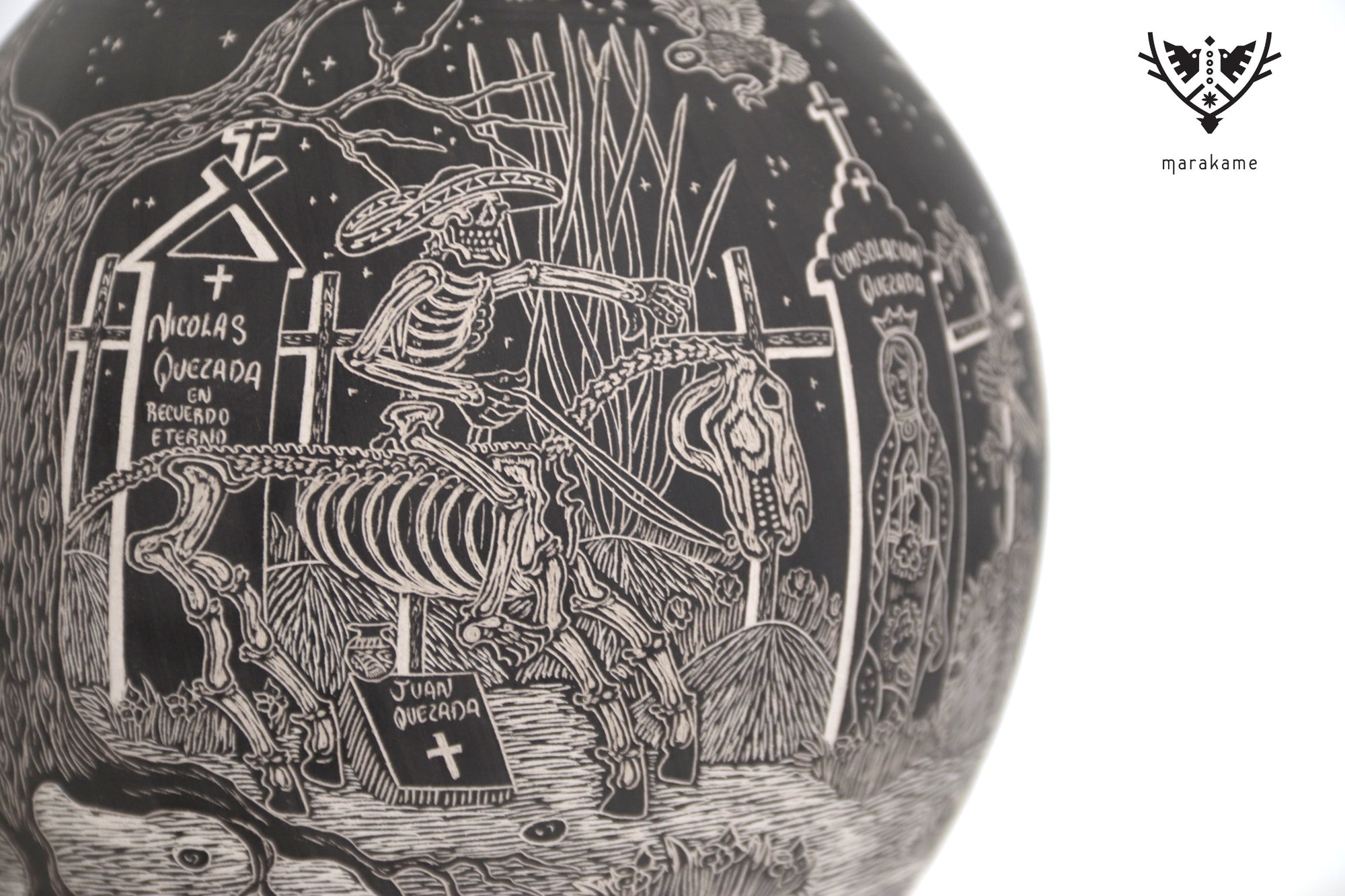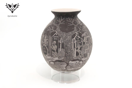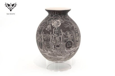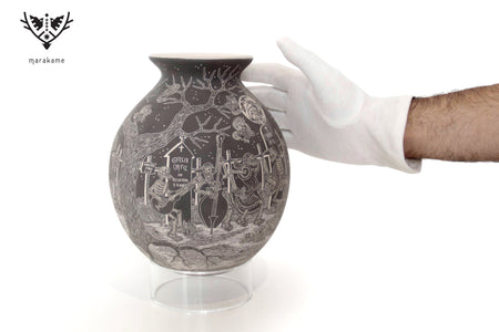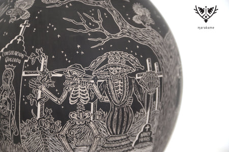 Cada trazo grabado sobre la superficie cerámica ha sido ejecutado con una precisión extraordinaria, logrando un nivel de detalle que envuelve por completo la pieza y transforma su volumen en un lienzo narrativo continuo. La escena fluye sin interrupción, guiando la mirada a través de un paisaje nocturno donde la muerte no es ausencia, sino presencia activa, movimiento y memoria.