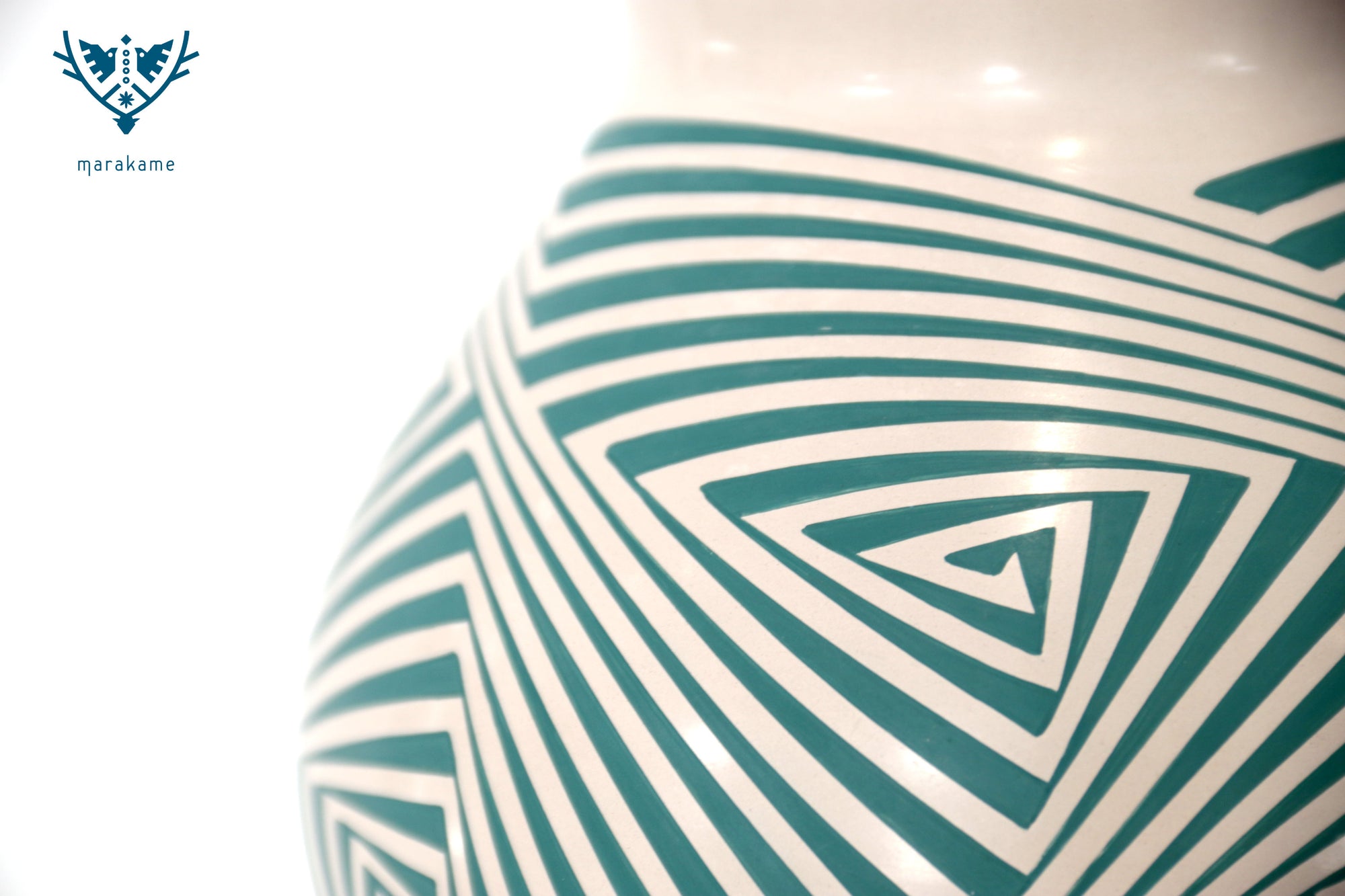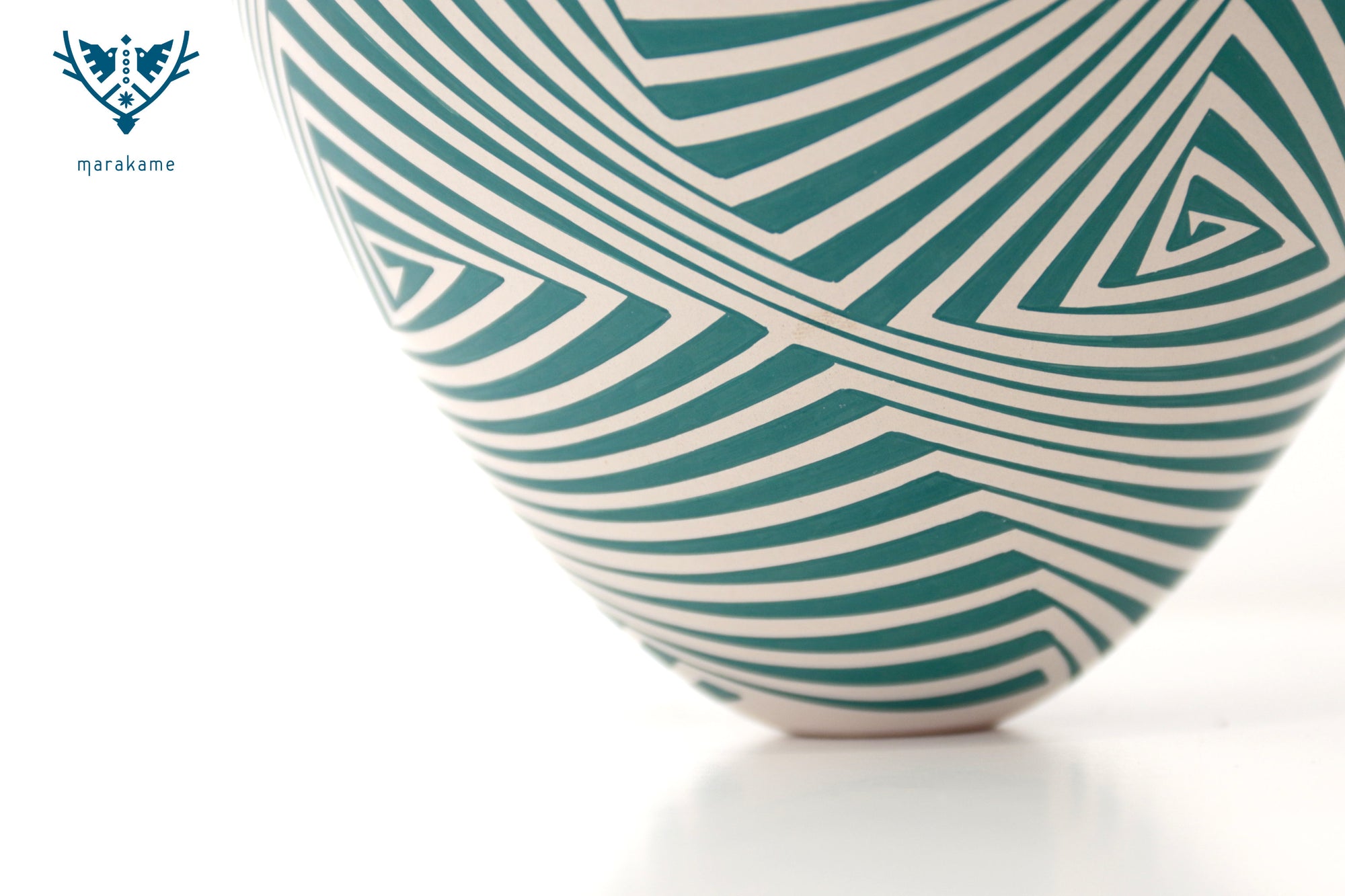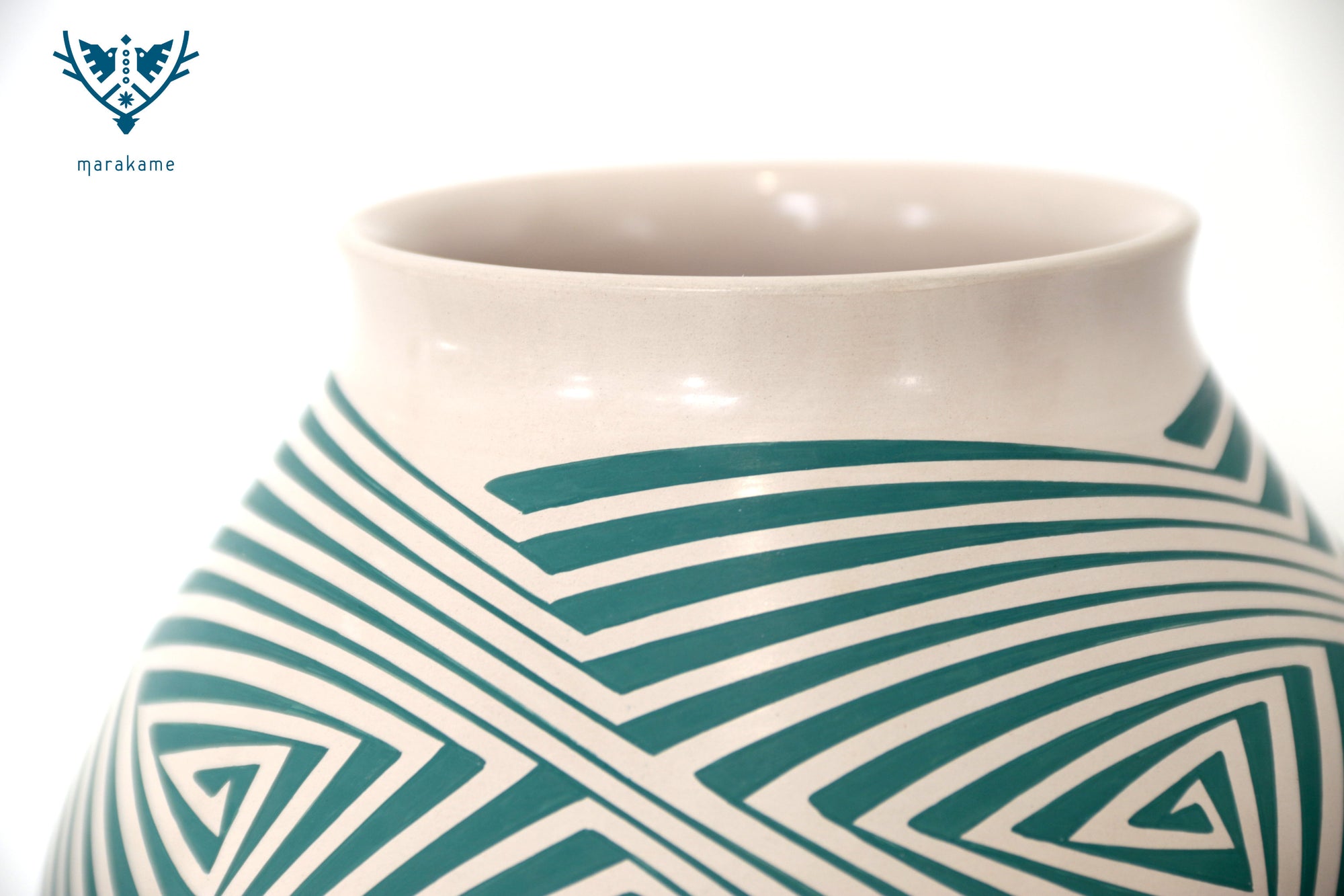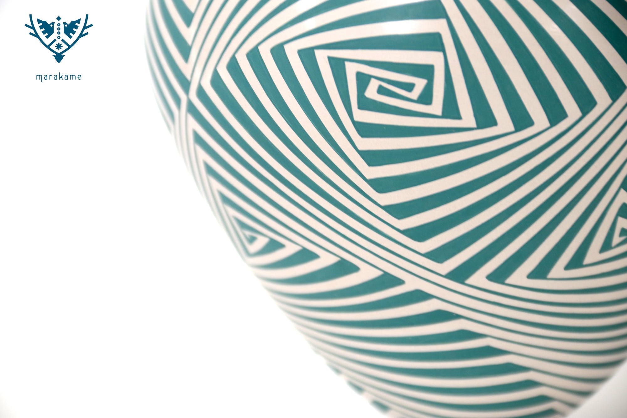 El contraste entre el blanco del barro y el turquesa profundo crea una sensación de frescura, evocando agua, cielo y horizonte. Cada trazo ha sido pintado a mano con precisión minuciosa, una práctica que requiere horas de pulso firme y conocimiento transmitido por generaciones.