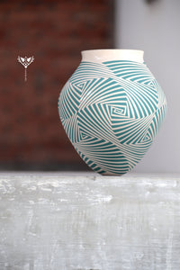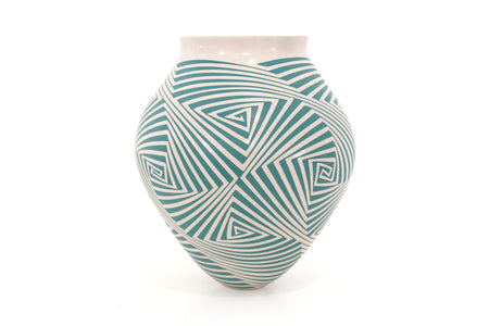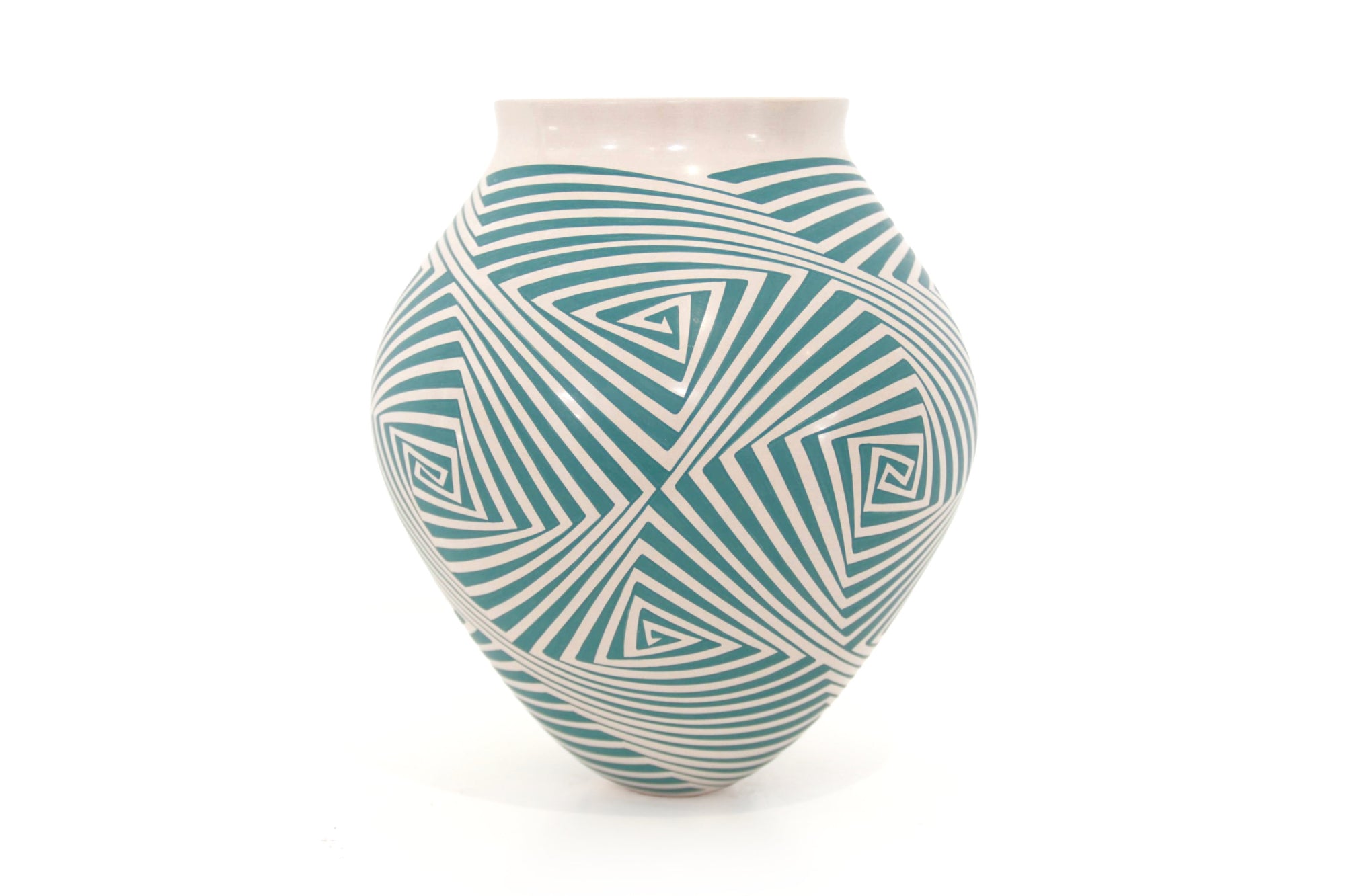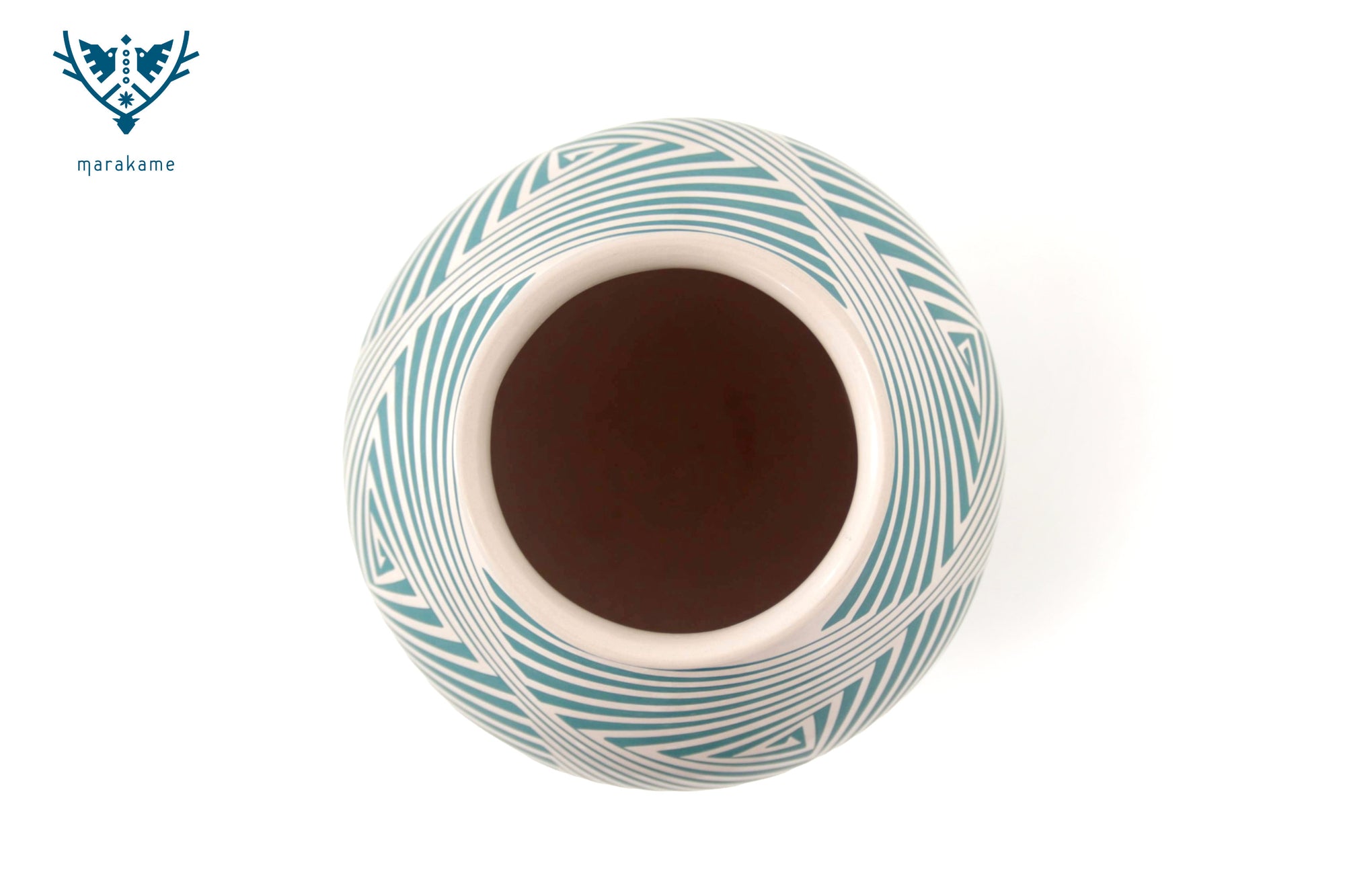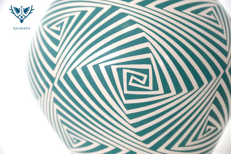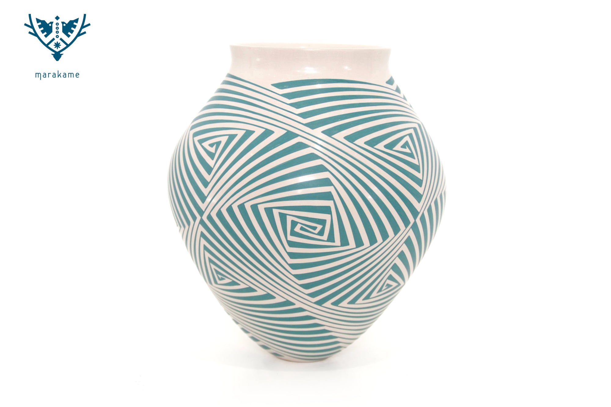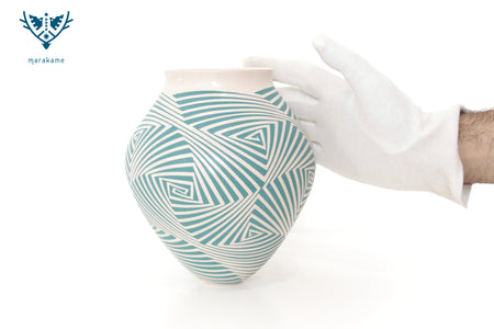 El contraste entre el blanco del barro y el turquesa profundo crea una sensación de frescura, evocando agua, cielo y horizonte. Cada trazo ha sido pintado a mano con precisión minuciosa, una práctica que requiere horas de pulso firme y conocimiento transmitido por generaciones.