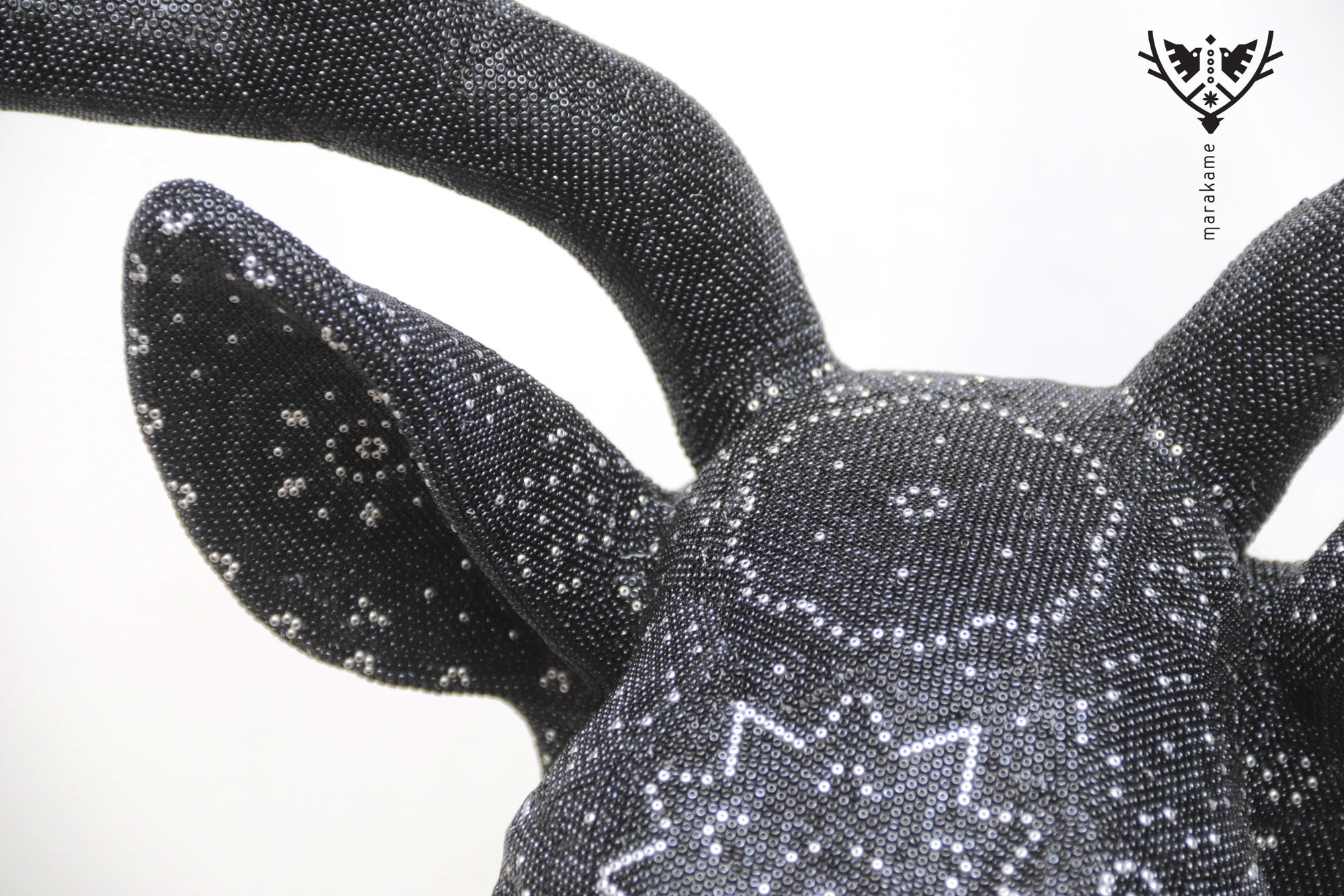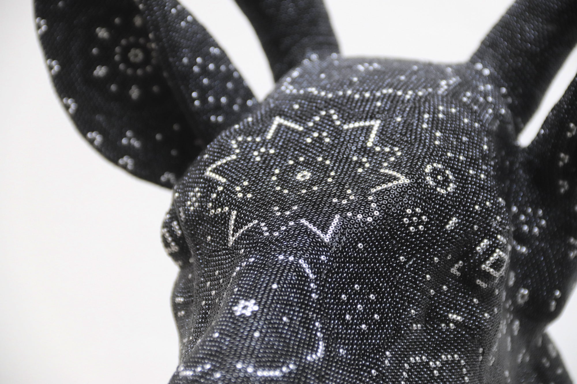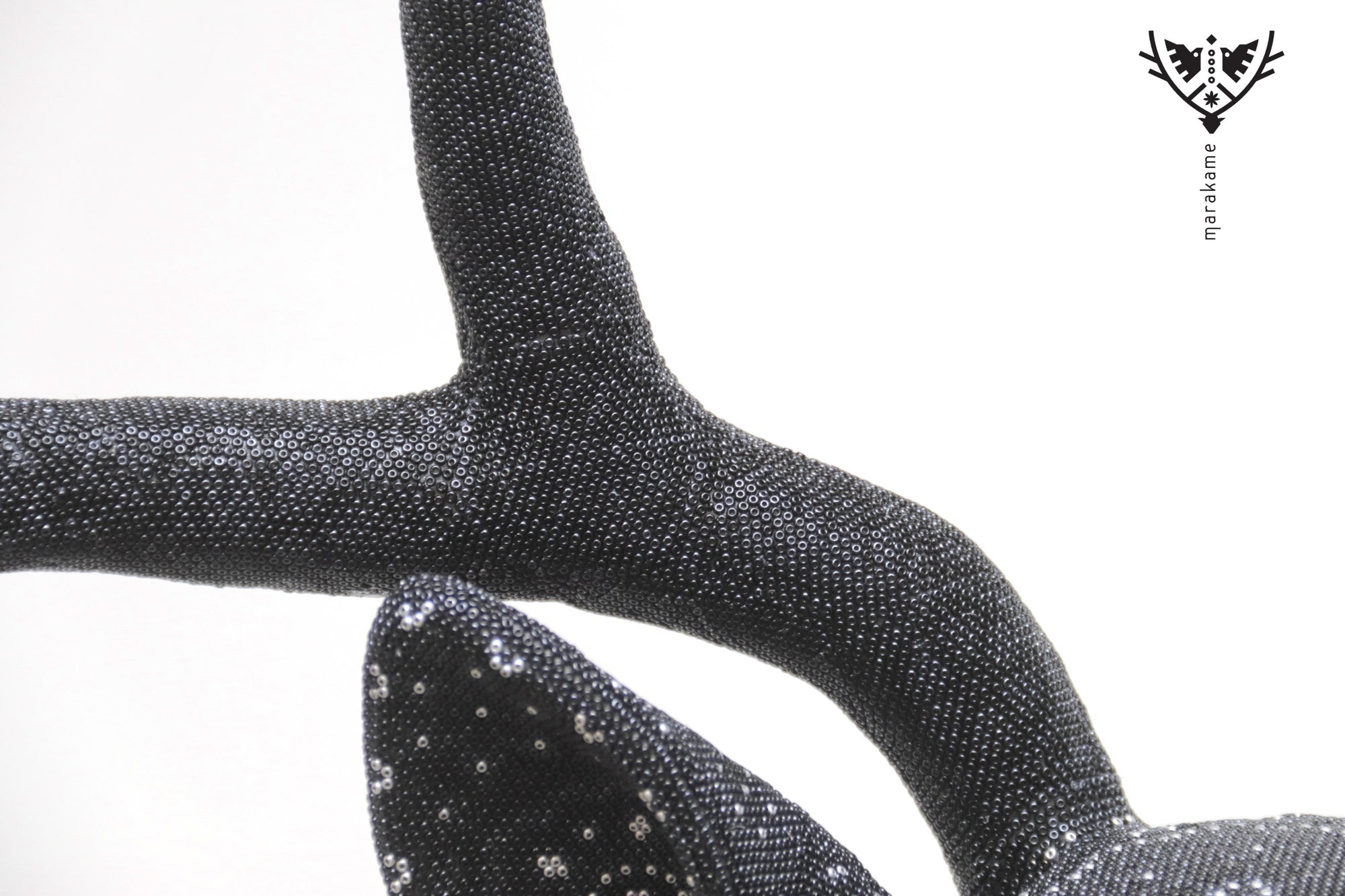 Este busto de venado huichol en escala real es una obra única intervenida con más de 350,000 chaquiras de cristal calibrado, hechos en la República Checa, uno a uno sobre fibra de vidrio. Los tonos negro, acero y aluminio le dan un carácter contemporáneo, pero su esencia es profundamente espiritual.
