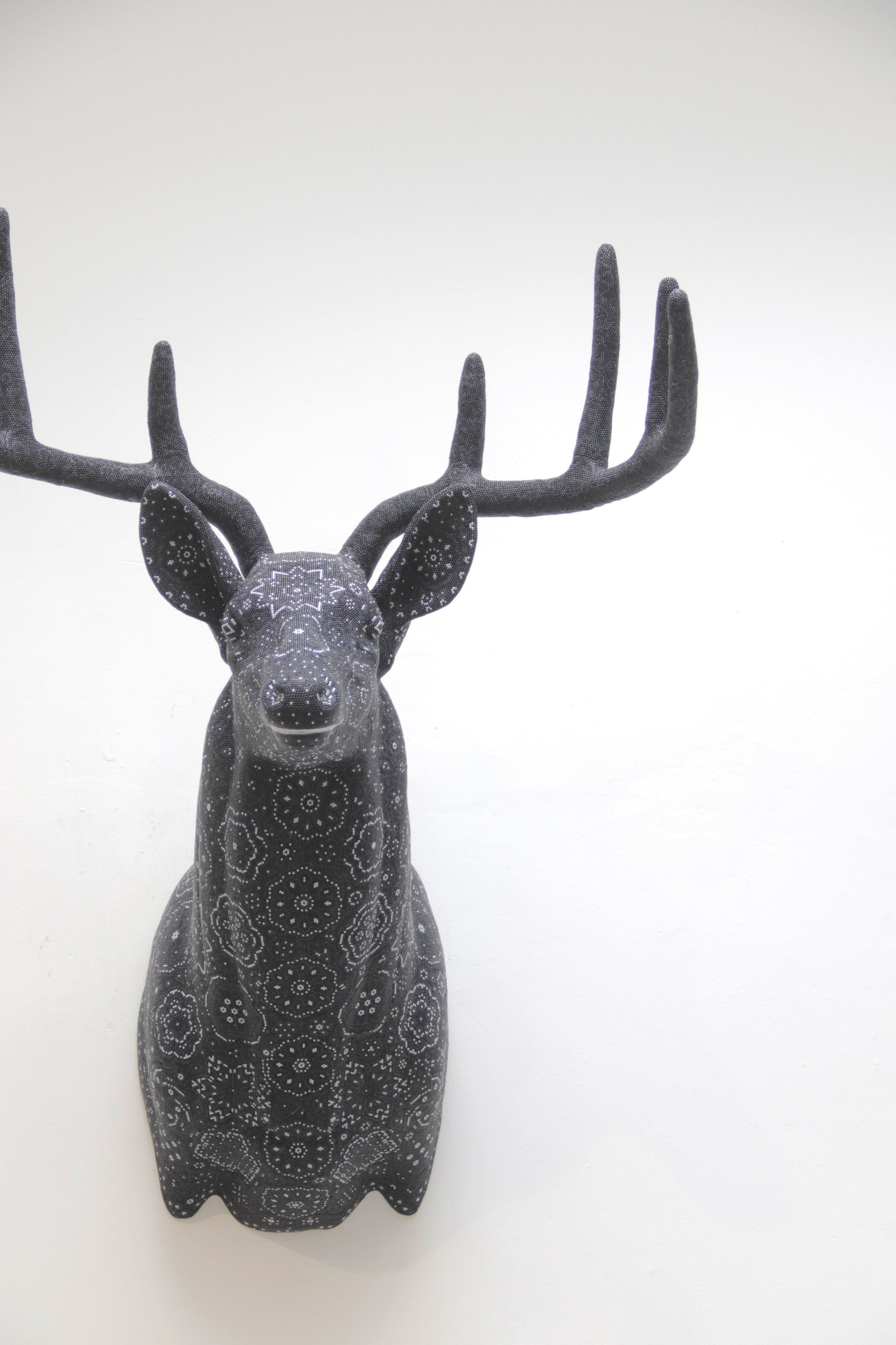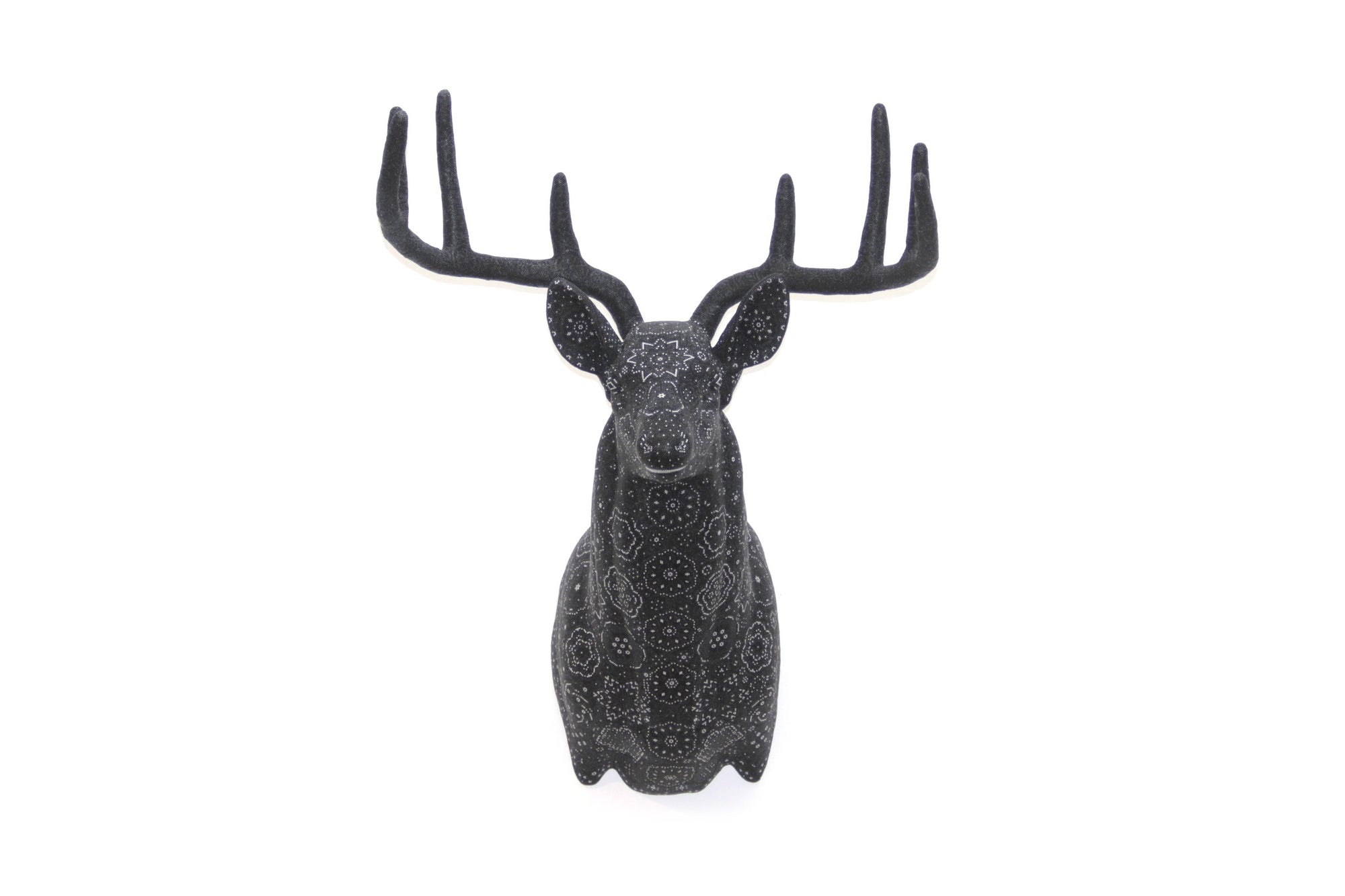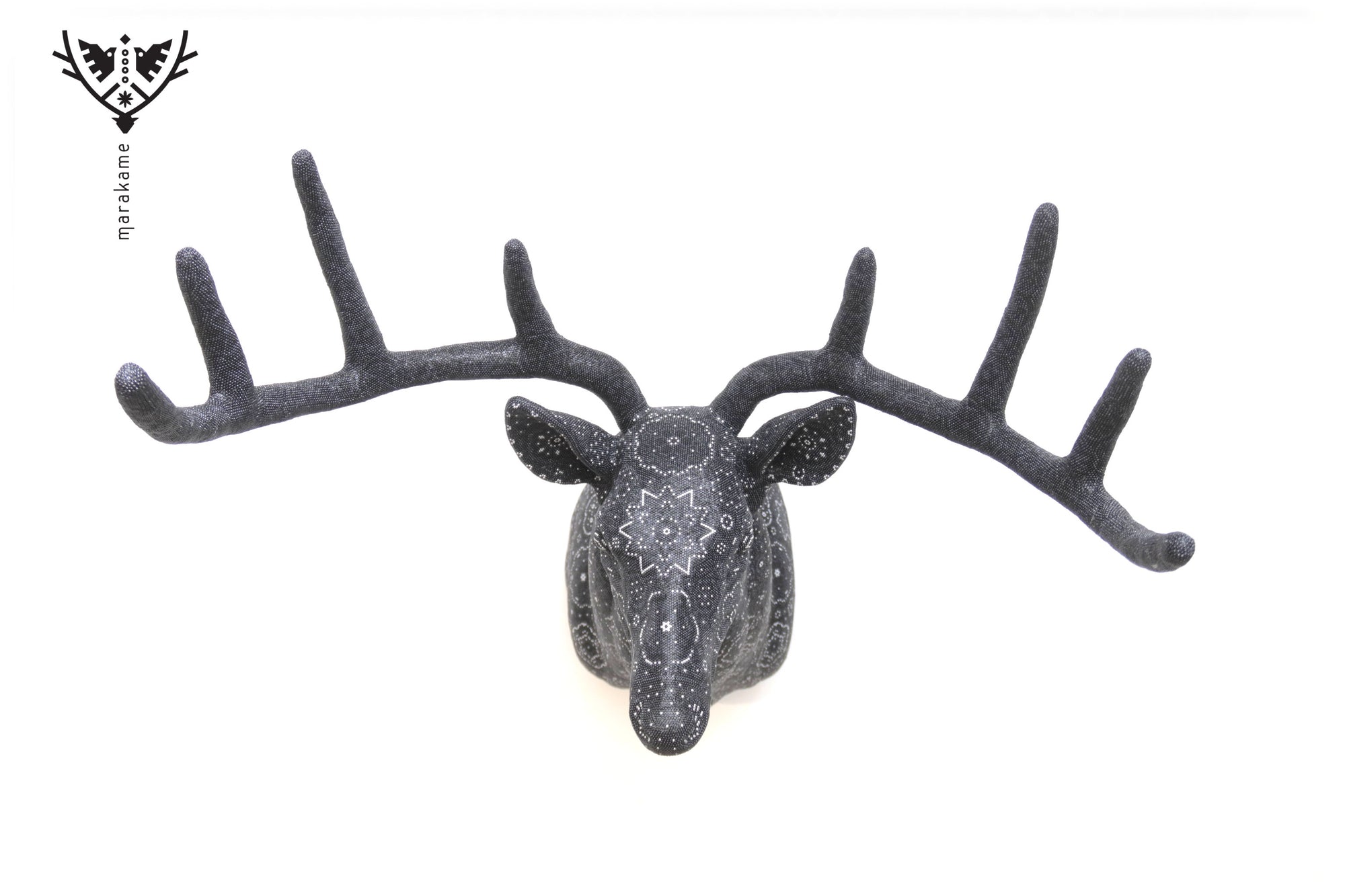 Este busto de venado huichol en escala real es una obra única intervenida con más de 350,000 chaquiras de cristal calibrado, hechos en la República Checa, uno a uno sobre fibra de vidrio. Los tonos negro, acero y aluminio le dan un carácter contemporáneo, pero su esencia es profundamente espiritual.