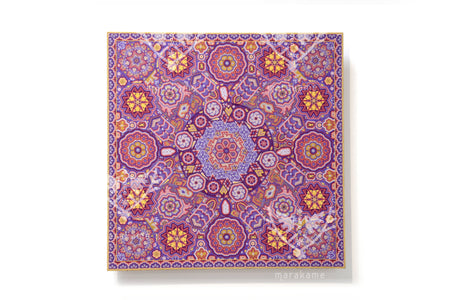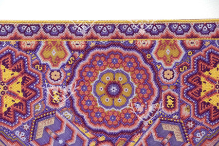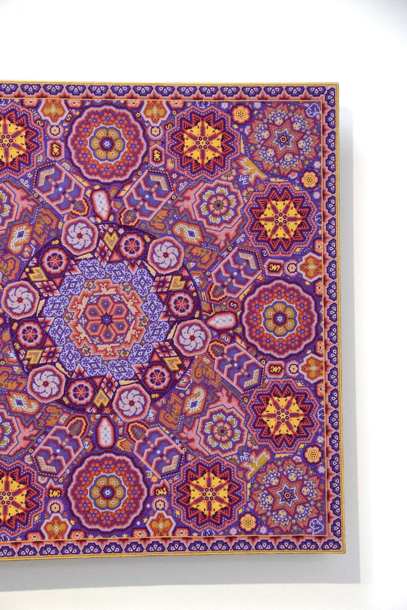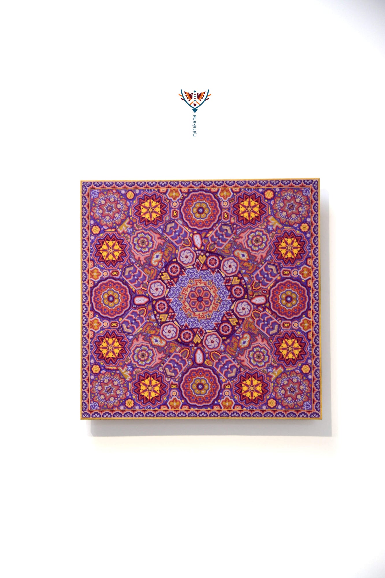 Este nierika honra a Tatei Yurienaka, la madre del maíz, quien alimenta el cuerpo y el espíritu de los hombres. En su composición, las formas estelares y florales giran en torno a un centro de equilibrio, donde convergen los colores de la fertilidad, el fuego y el amanecer. Los tonos violetas y dorados evocan la transformación de la semilla en vida, mientras las figuras geométricas narran los ciclos de la tierra y la continuidad del tiempo sagrado. Cada cuenta de chaquira guarda una ofrenda, una palabra tejida al ritmo de la creación.